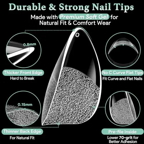 [ULTRA MATTED & STRONGER ADHESION] Stop wasting time filing your nail tips. Our upgraded soft gel nail tips feature the latest 70-grit ultra-matte technology on the inner side, providing a superior grip that fits your natural nails perfectly. When used with professional glue, enjoy a salon-quality manicure that lasts up to 28 days without peeling or popping off.