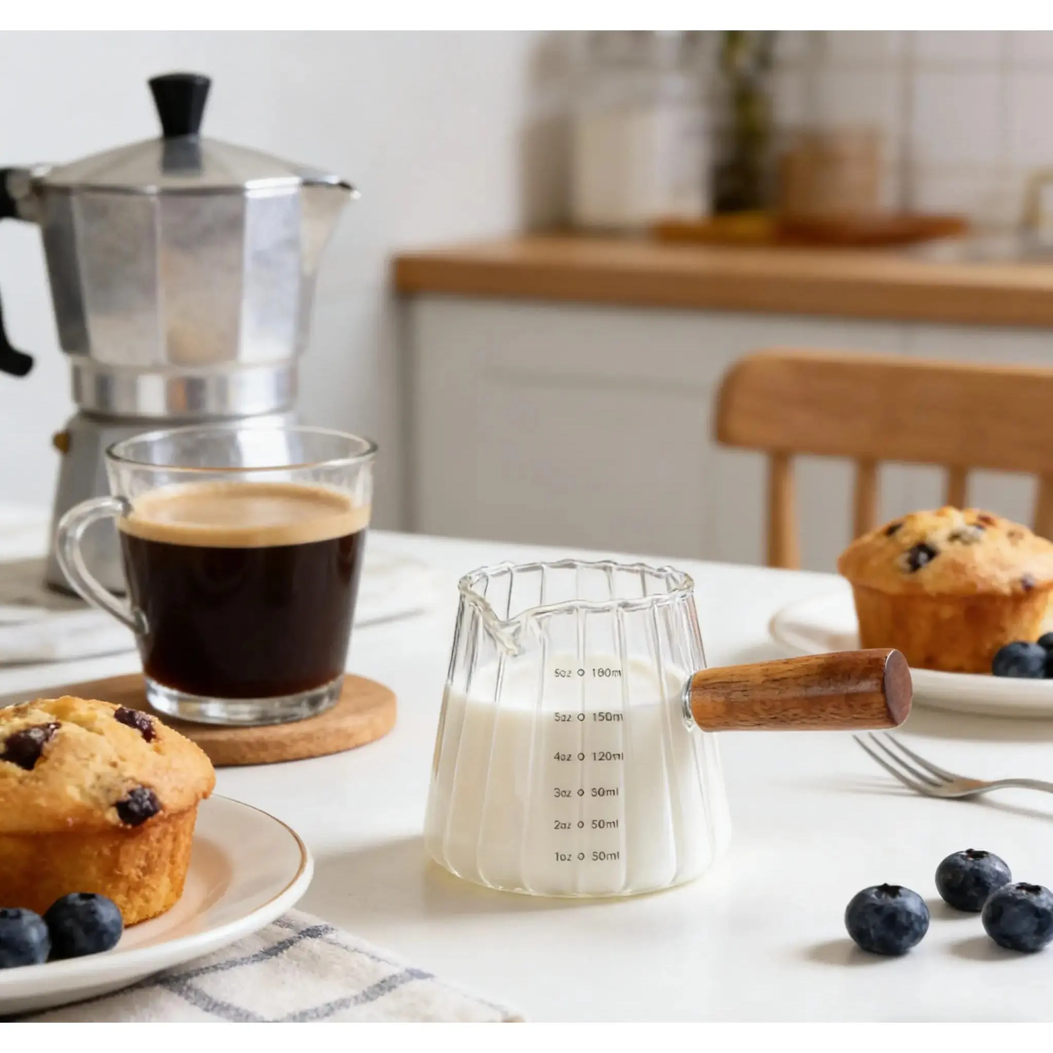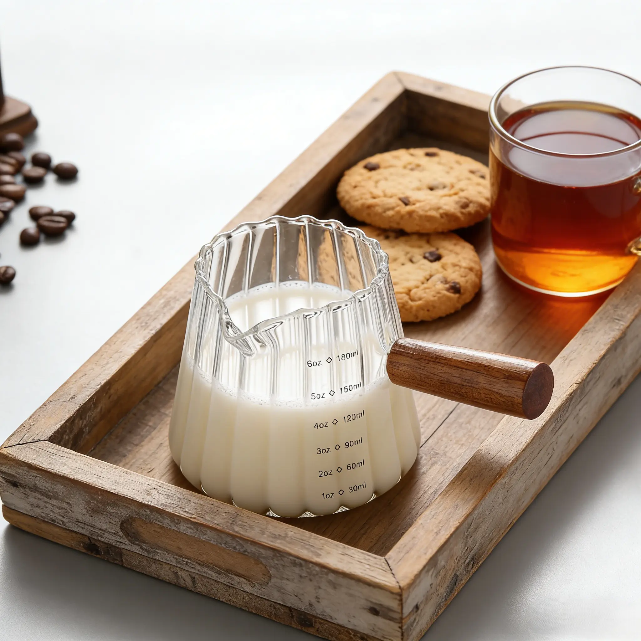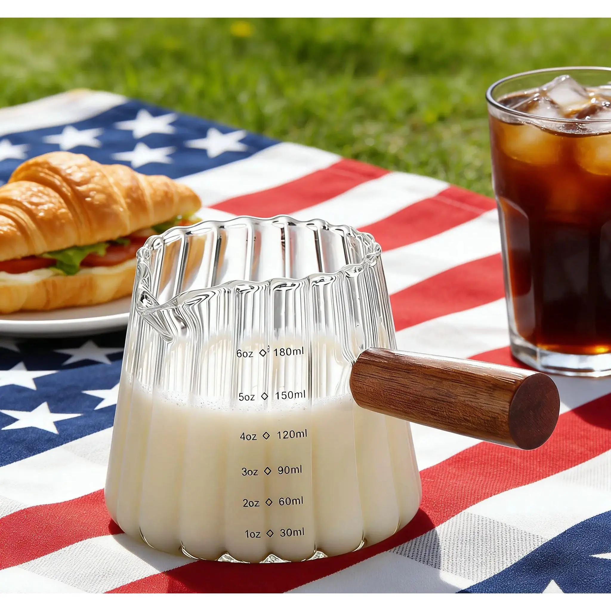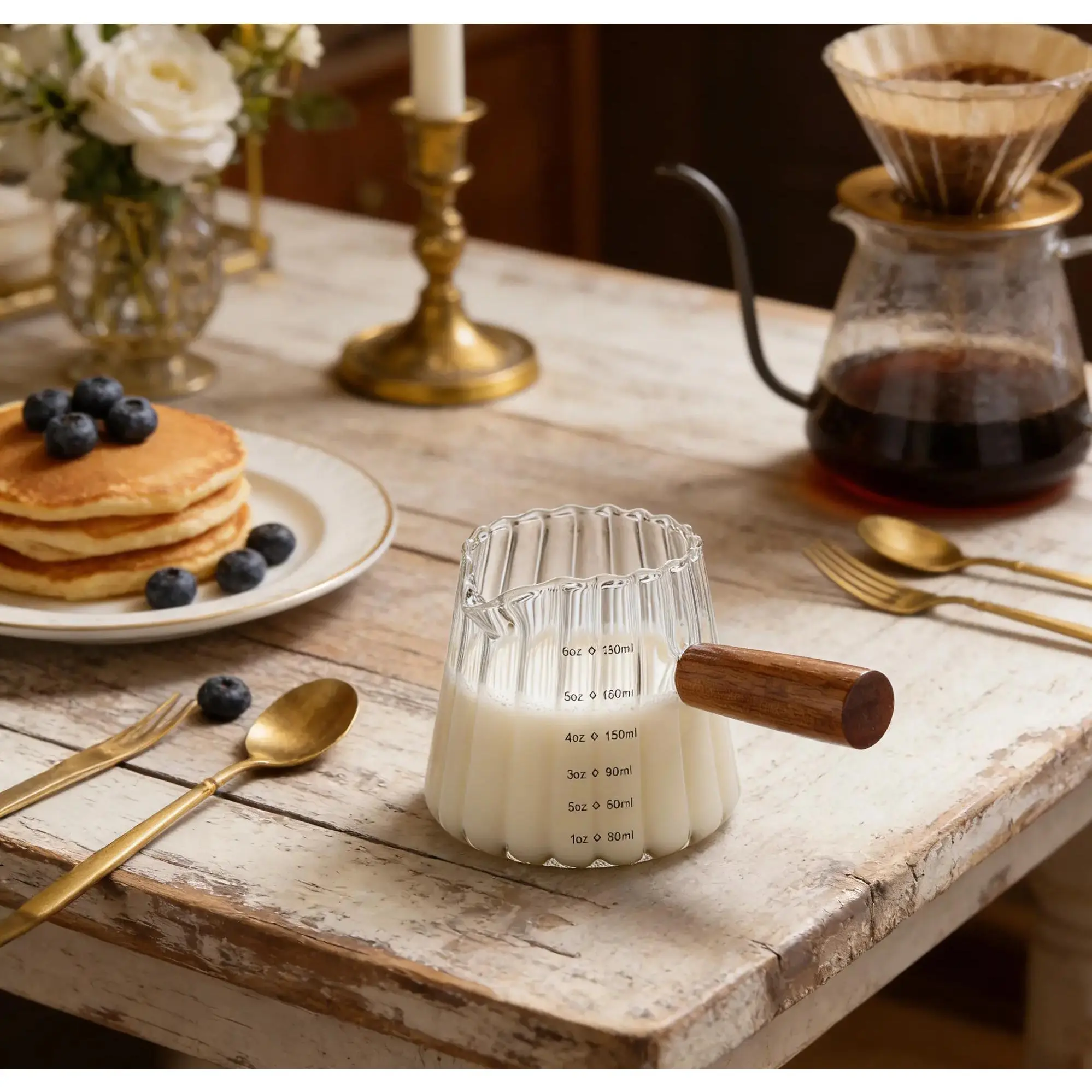Material & Design: This creamer pitcher is made from borosilicate glass, ensuring durability and heat resistance.It features a wooden handle for a comfortable grip.🌳