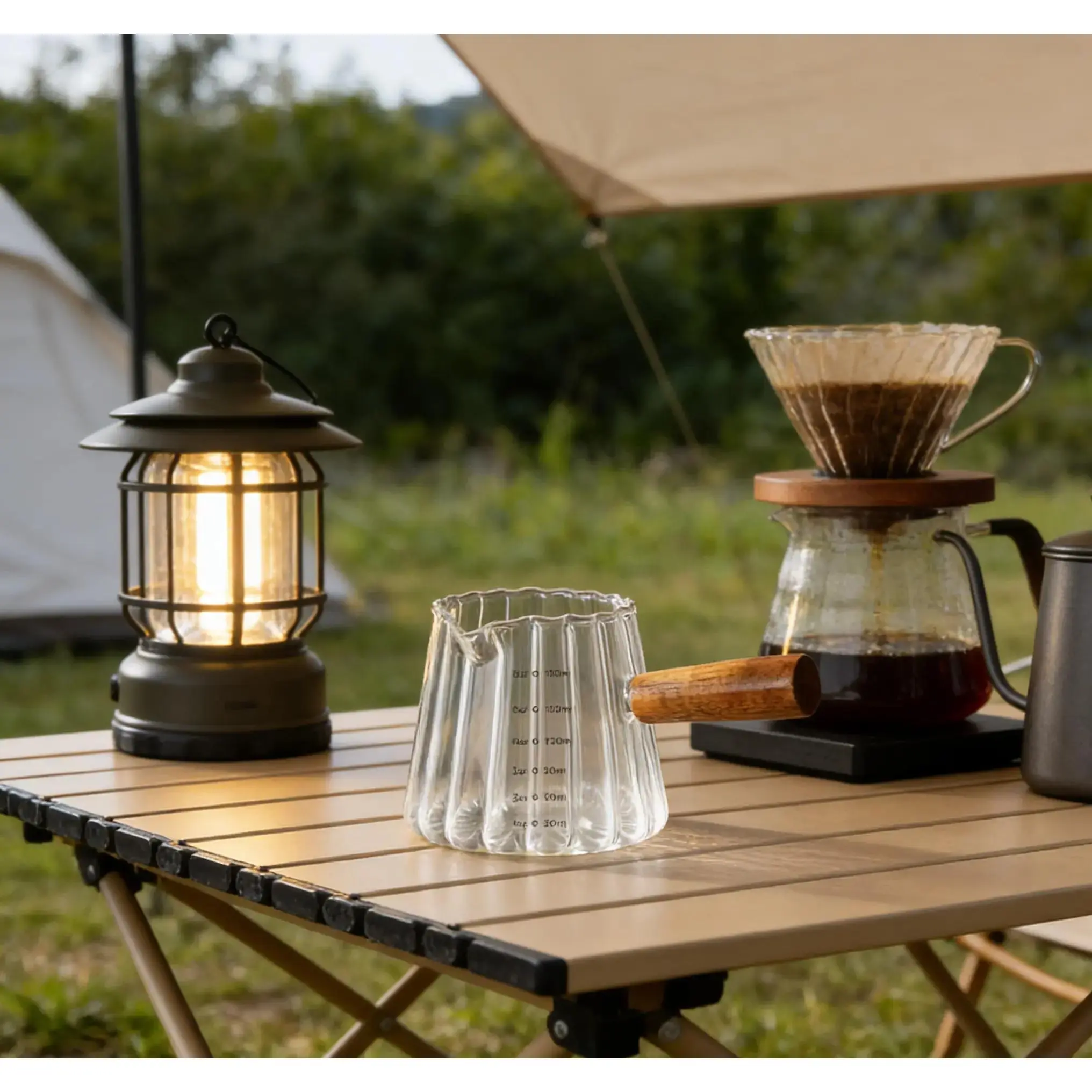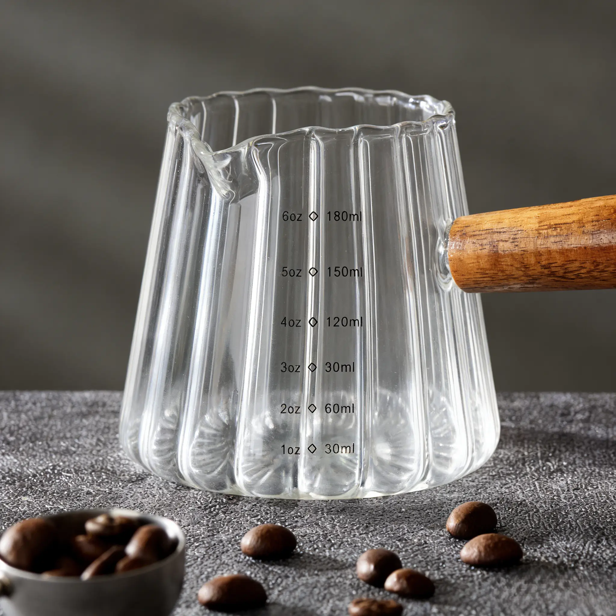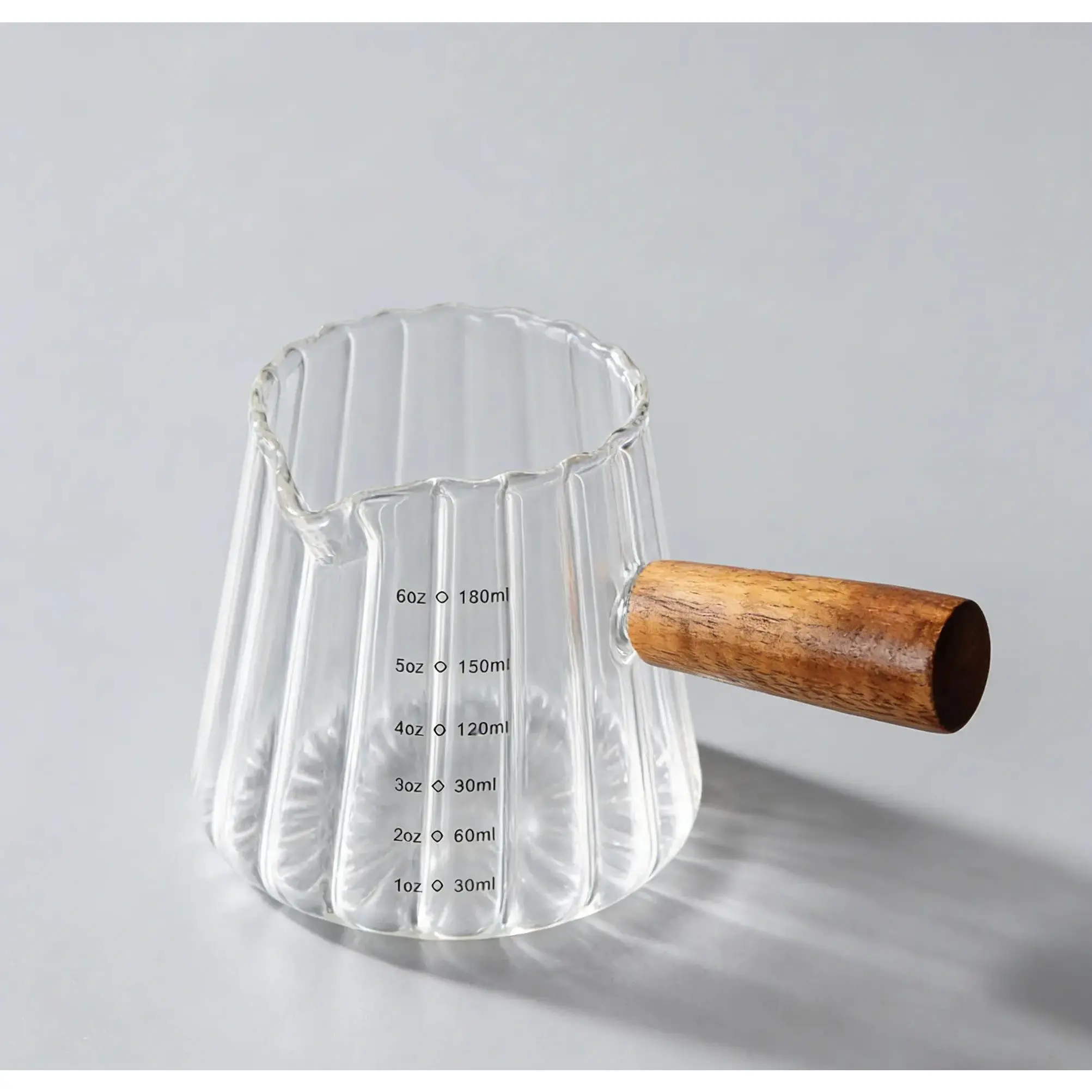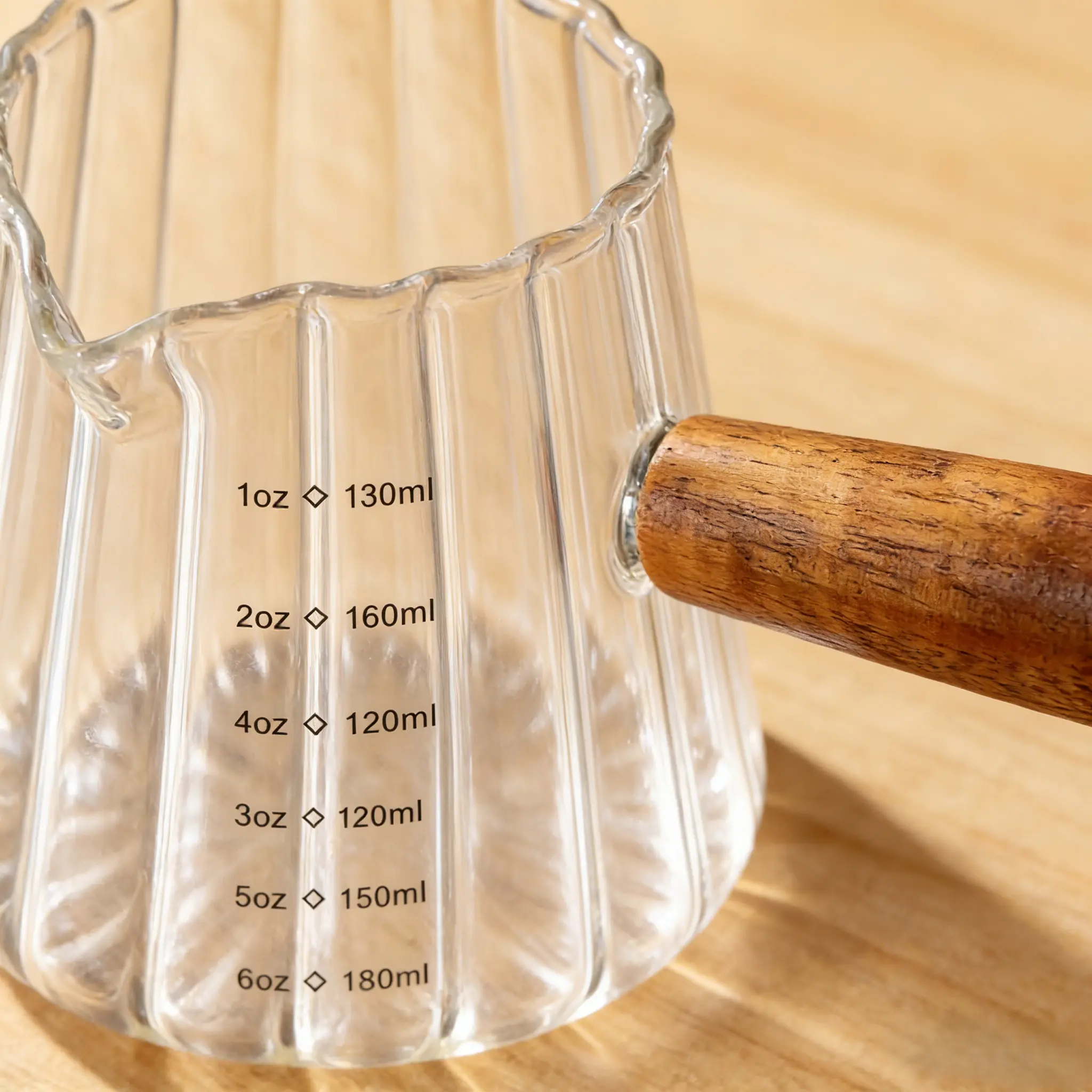 Material & Design: This creamer pitcher is made from borosilicate glass, ensuring durability and heat resistance.It features a wooden handle for a comfortable grip.🌳