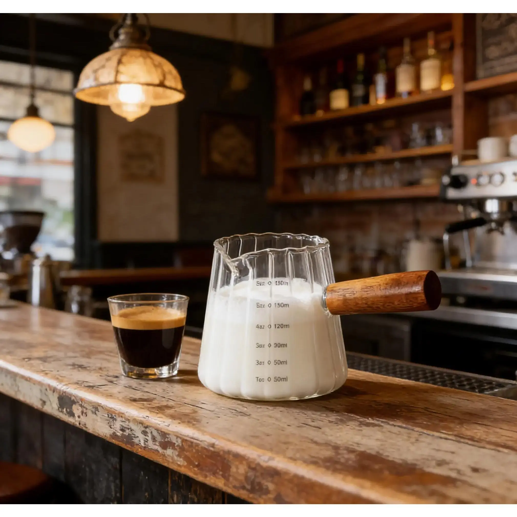 Premium Borosilicate Glass Creamer Pitcher with Wooden Handle| 180ml Heat-Resistant Coffee Milk Jug| 120°C Thermal Shock Resistant, No Cracking