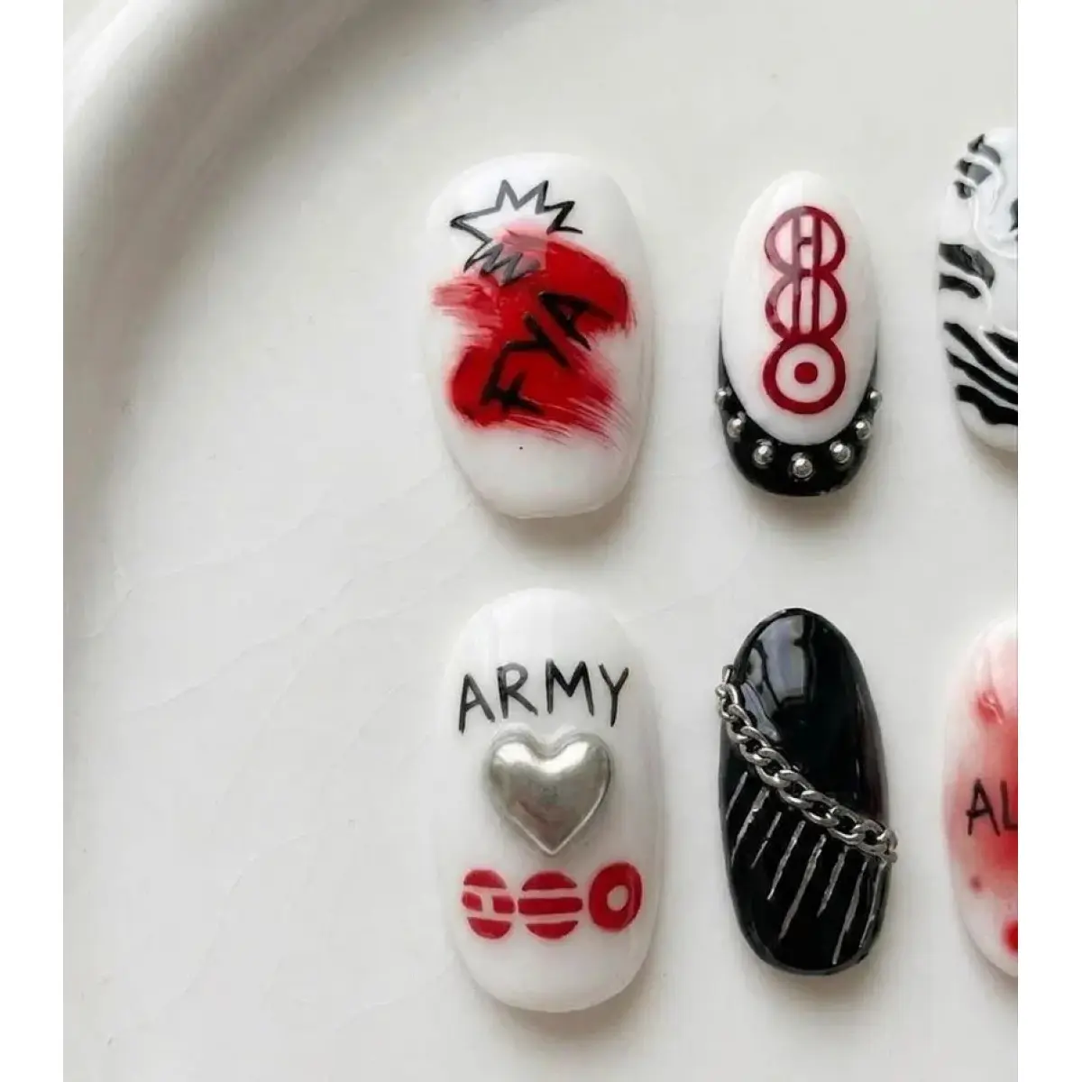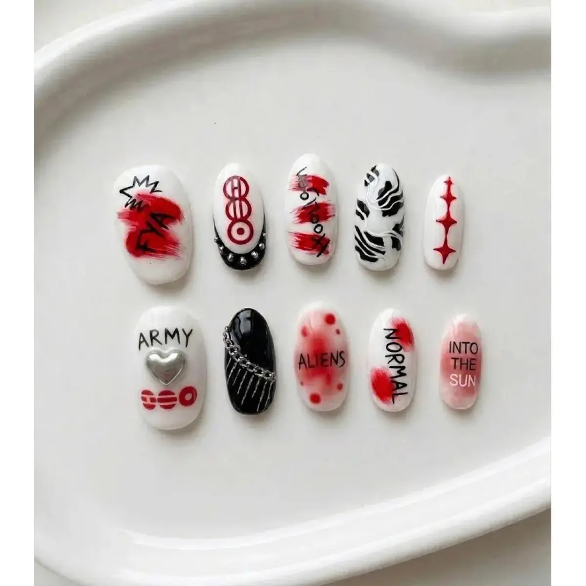 KPOP Press On Nails, Red Black Edgy Text, Punk Handmade Set