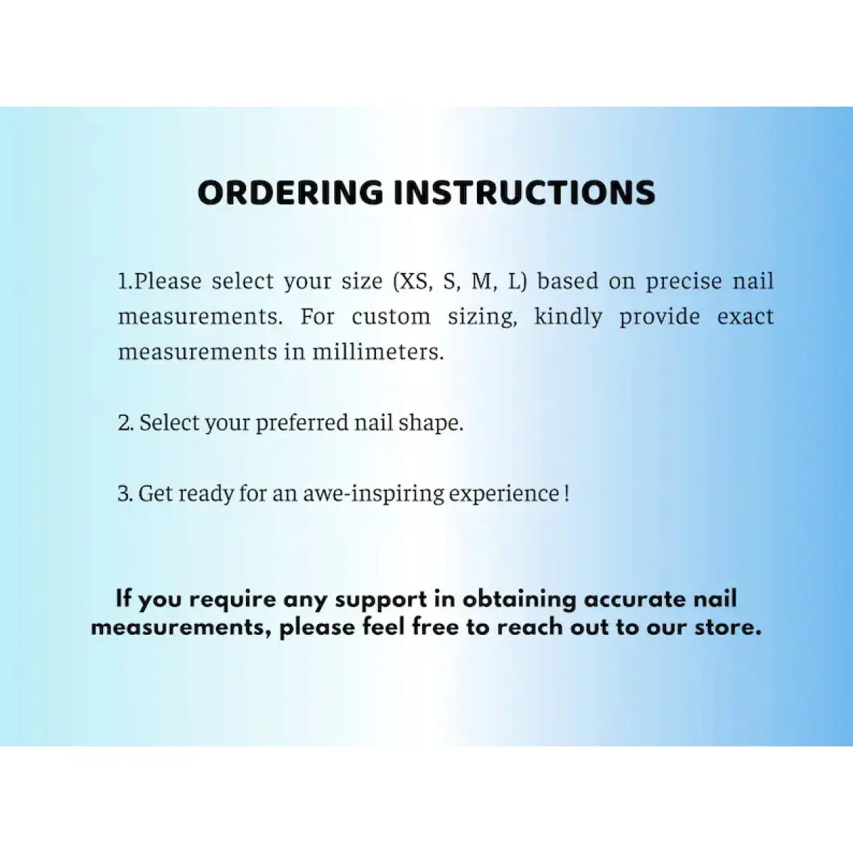 If you're unsure about sizing or would like a custom fit, simply fill out the personalization section when ordering.I’m always happy to assist you in measuring your nails.