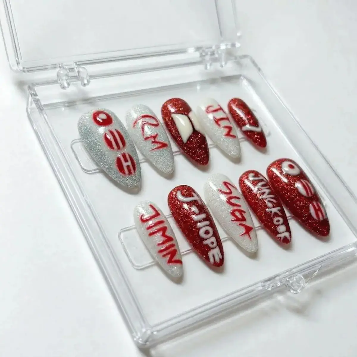 Kpop Press On Nails, Red and White Glitter Bangtan Army Fake Nails, K-pop Concert Ready False Nails, Army Fandom Nails