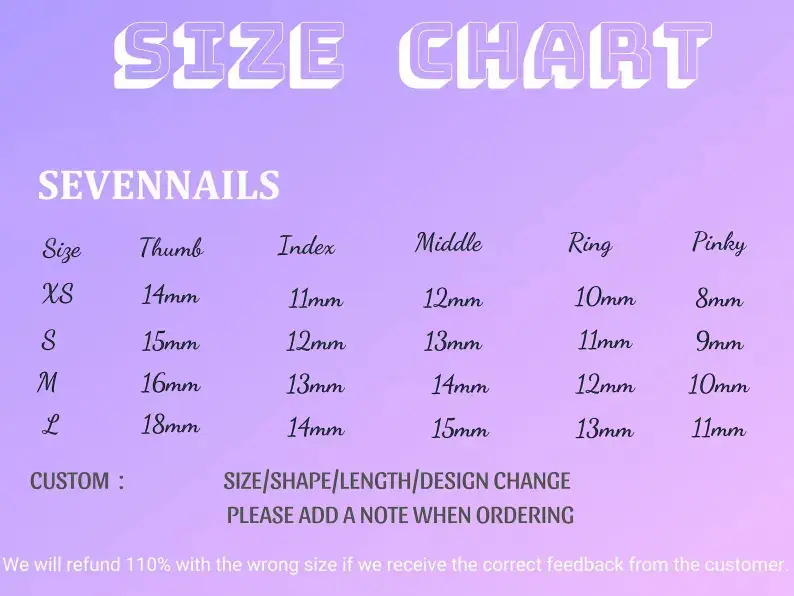 The secret to a "salon-look" press-on is the perfect fit.If you are unsure of your sizes, do not worry!Simply place your natural nails on a flat surface next to a Standard Coin and take a clear photo from directly above.Send this photo to us via messages, and we will use digital scaling to determine your exact sizes.This ensures 100% comfort and a seamless, professional finish.