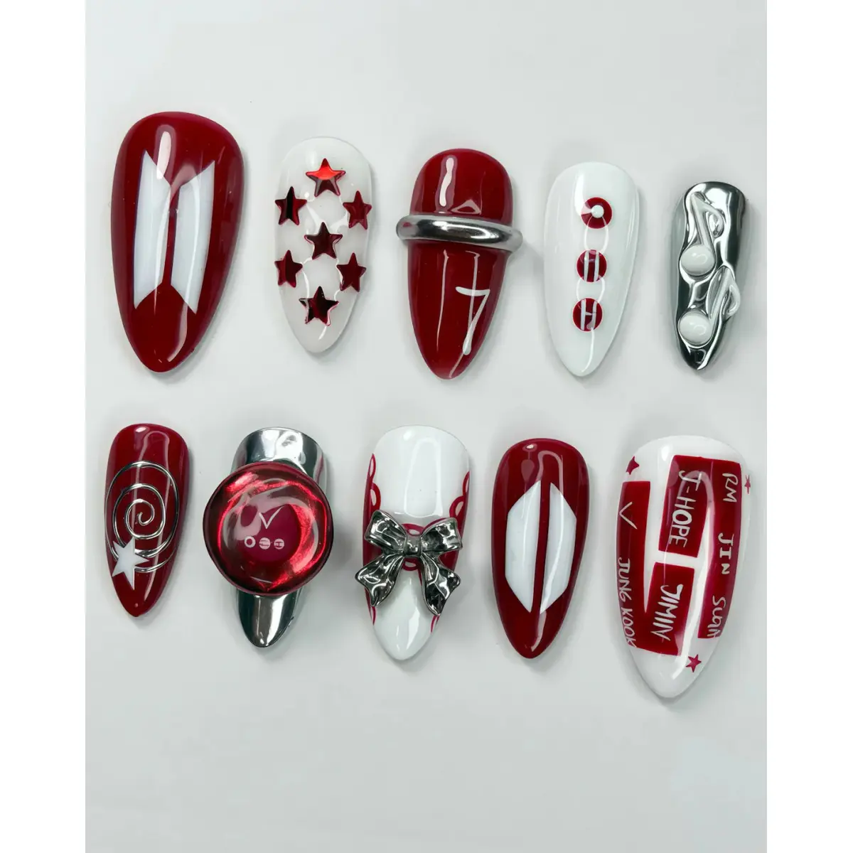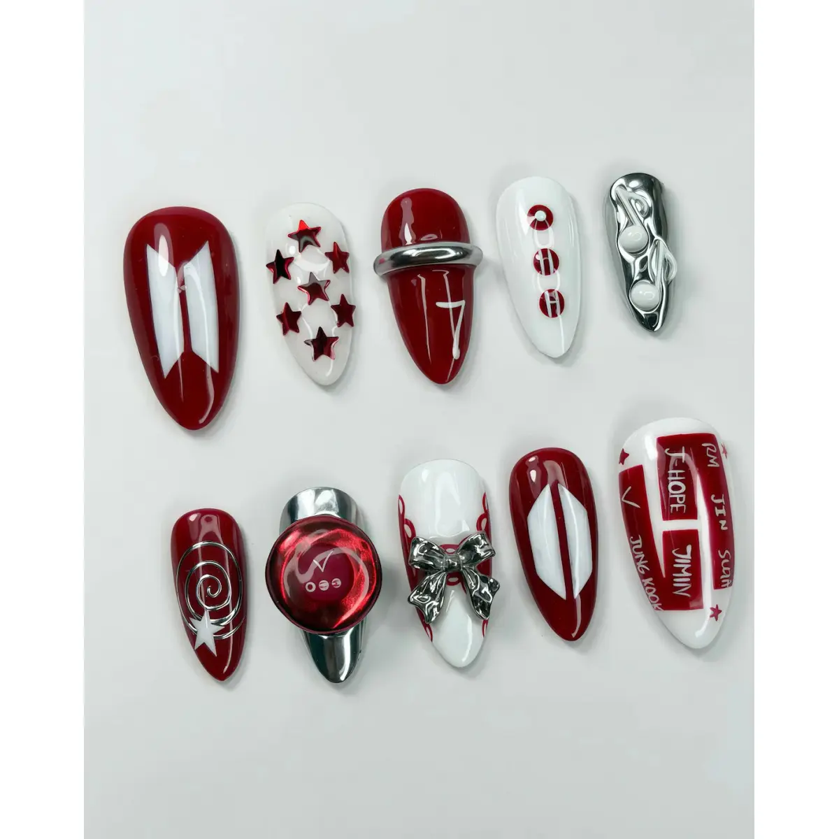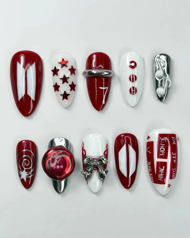 BTS OT7 Concert Press On Nails, Red and White ARMY Fandom Fake Nails, All Member Names Custom Nail Art, 3D Silver Chrome Kpop Merch