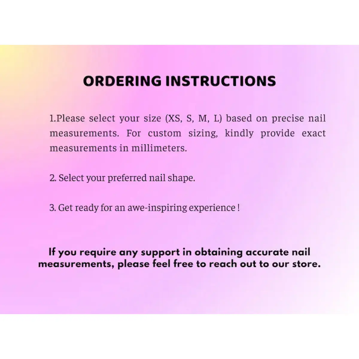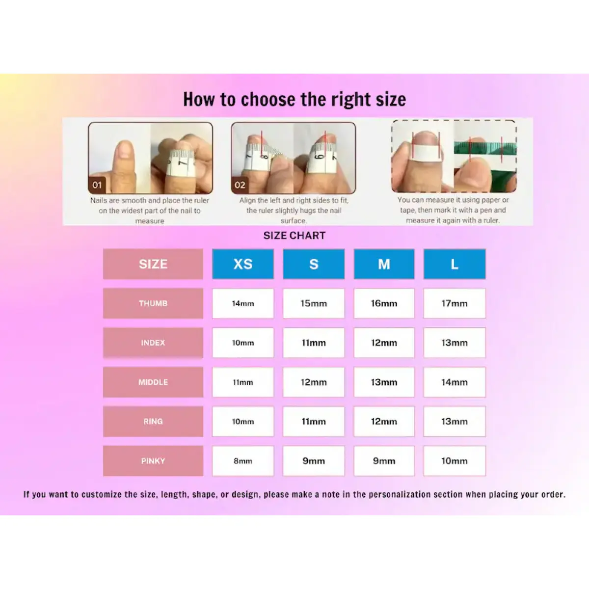 All of my nails are handmade and customized to fit your size.Please note that I can make any size and any shape you desire.Feel free to contact me if you would like some customization made.