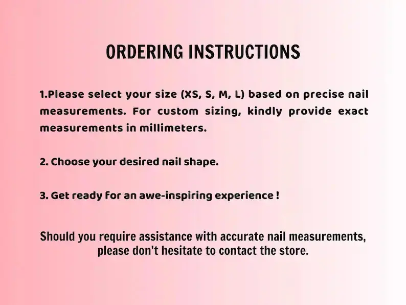 The secret to a "salon-look" is the perfect fit.If you are unsure of your sizes, simply place your natural nails on a flat surface next to a Standard Coin and take a clear photo from directly above.Send it to us via messages, and we will use digital scaling to determine your exact sizes for 100% comfort.