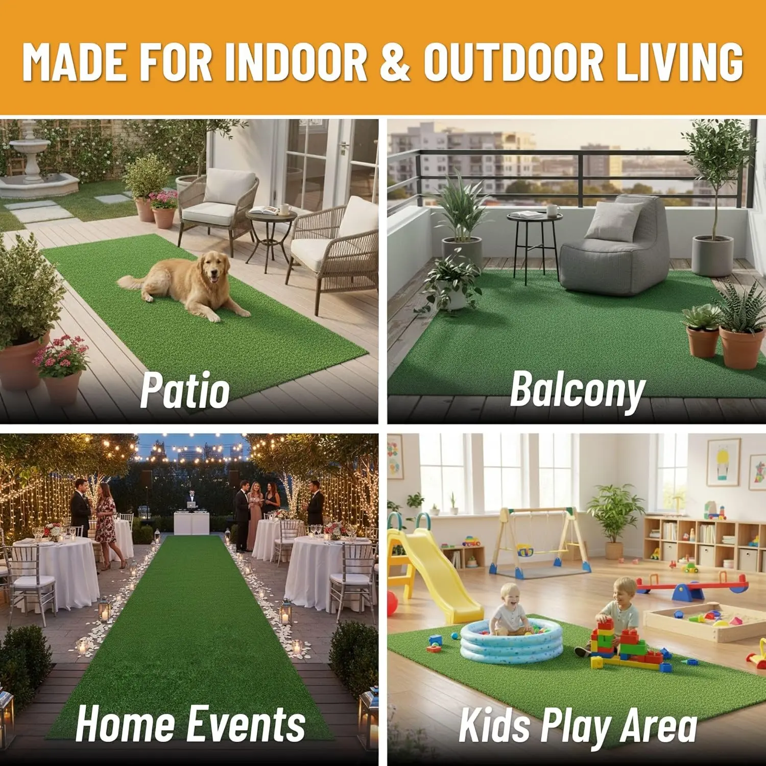·[ARTIFICIAL GRASS LOOK FOR OUTDOOR DECOR]: Faux turf surface with a 0.35" pile provides the appearance of artificial grass, adding a clean green look that complements outdoor spaces without the need for real lawn installation.