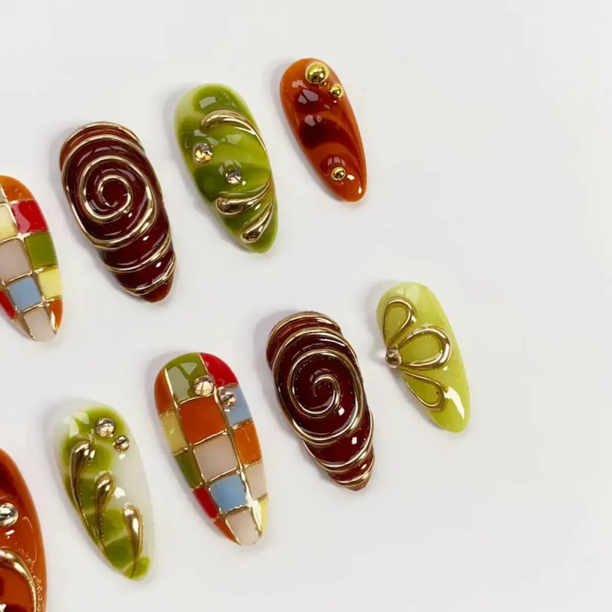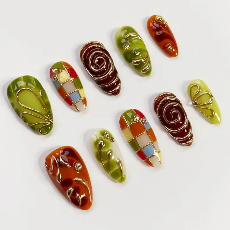 Green Plaid Nails/Spring Dreamy Press on nails long almond nails/Brown Nails/3D Gold Chrome nails/Garden Nails/Swirl nails/Custom nails