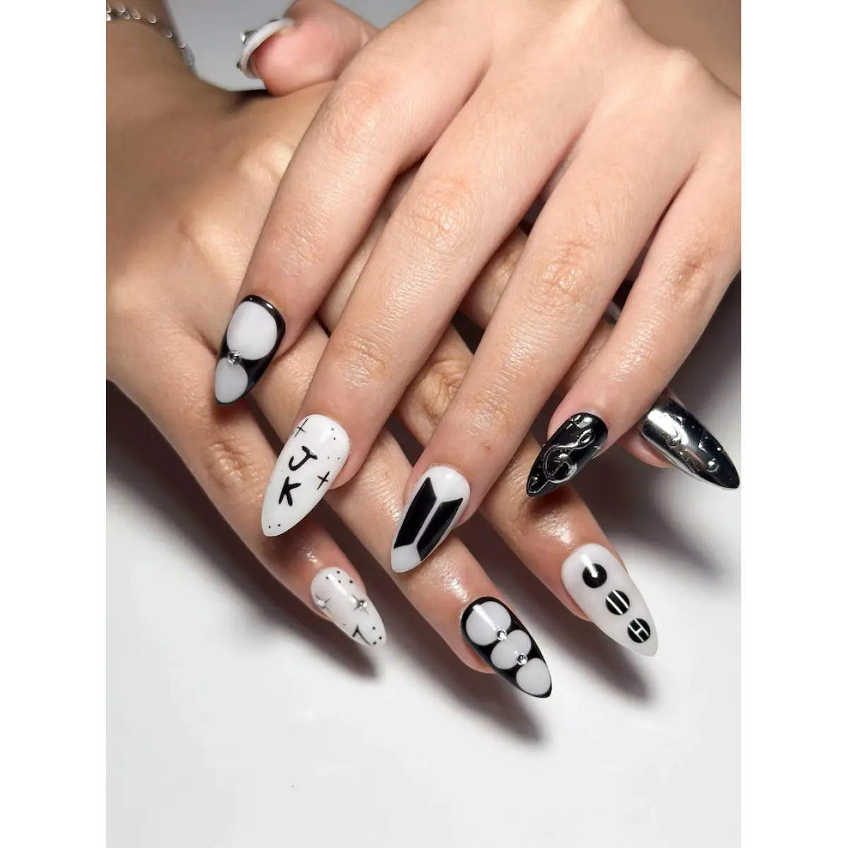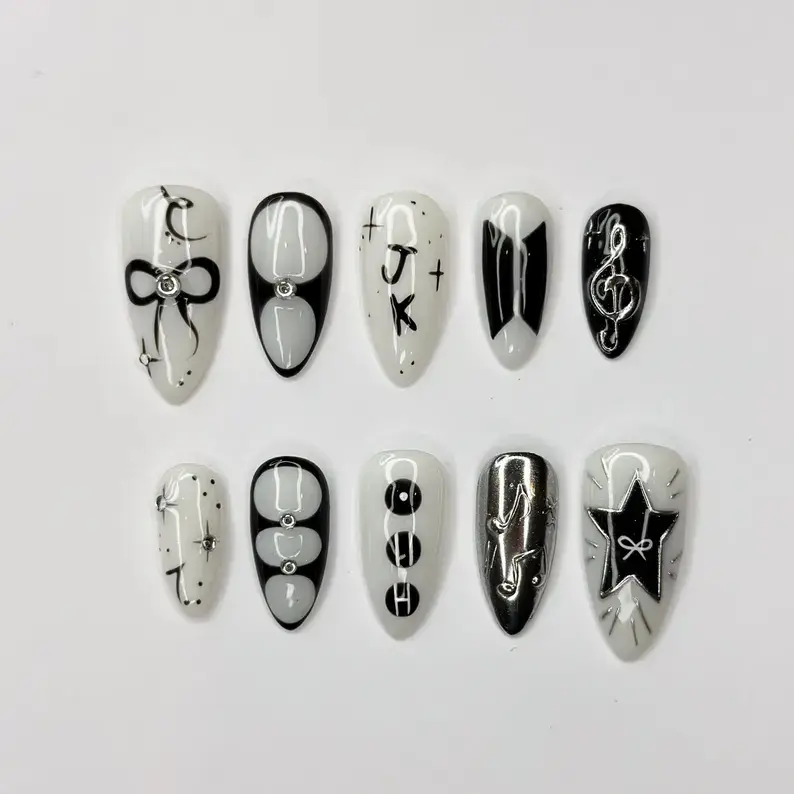 Celebrate the artistry and iconic style of JungKook with our meticulously crafted JK Solo Era Press-on Nails.This intricate set is a wearable tribute to his dynamic solo journey, blending a powerful Black and White palette with the raw energy of a global superstar.Designed for the dedicated fan who carries the music with pride, these nails are a sanctuary of style for concerts, events, or your most confident daily looks.