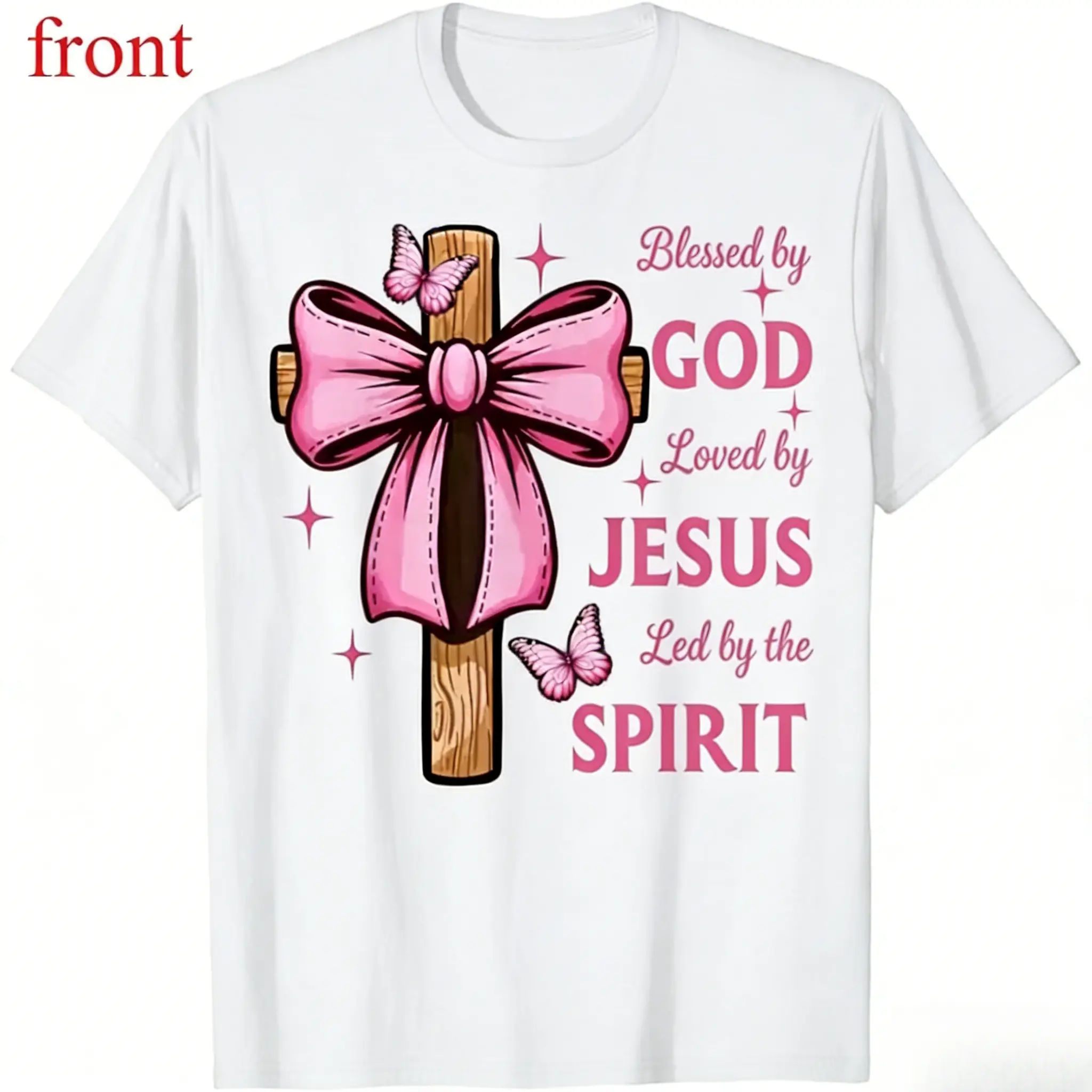Plus-size T-shirt, unisex T-shirt,Blessed by God Loved by Jesus Pink Coquette Bow And Cross T-Shirt Black Pieces Prints Womenswear..