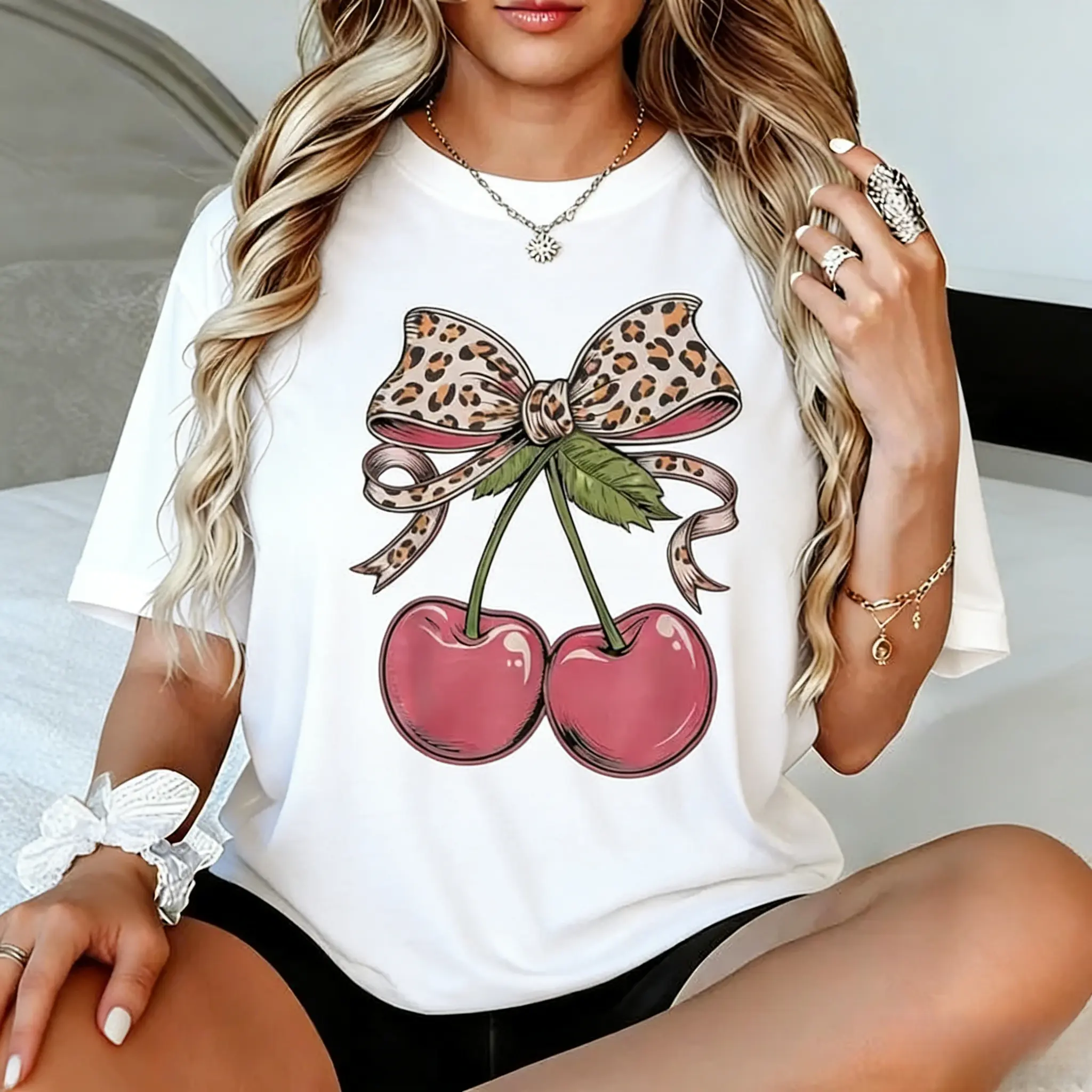 Plus size T-shirt, Women's Cherry Cherries Leopard Bow Print Short Sleeve Crew Neck T-Shirt T-Shirt For Men And Women