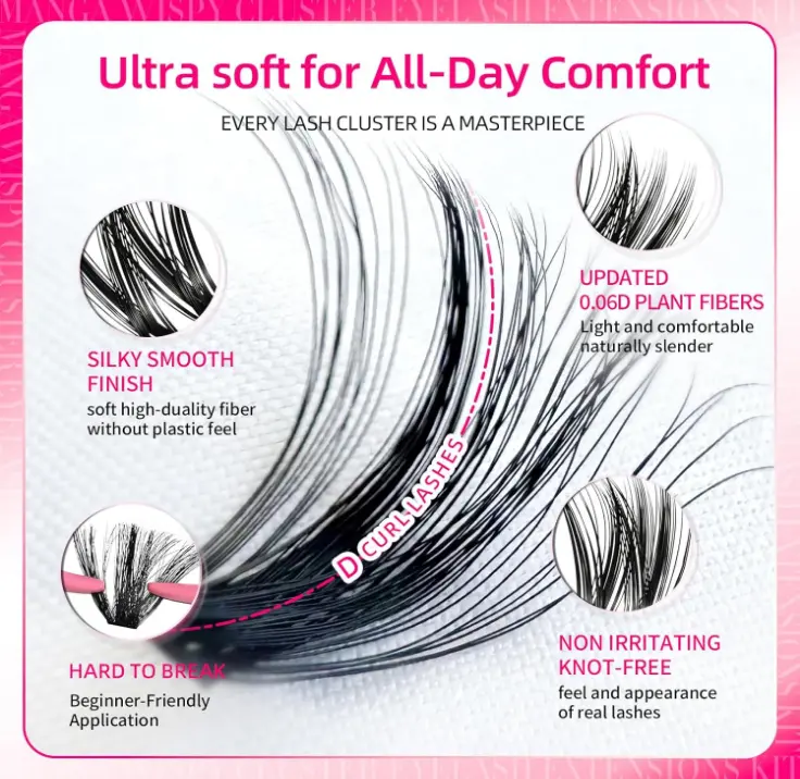 ·Luxurious, Updated Fibers for a Natural Look: Our natural lash clusters are crafted from high-quality, updated matte black 0.06D plant fibers that are soft, lightweight, non irritating and knot-free, mimicking the feel and appearance of real anime lashes. Individual cluster lashes are suitable for all eye types. The ultra-thin band ensures a seamless, barely-there blend with your natural eyelashes, providing all-day comfort and a realistic finish that's not "plasticky."