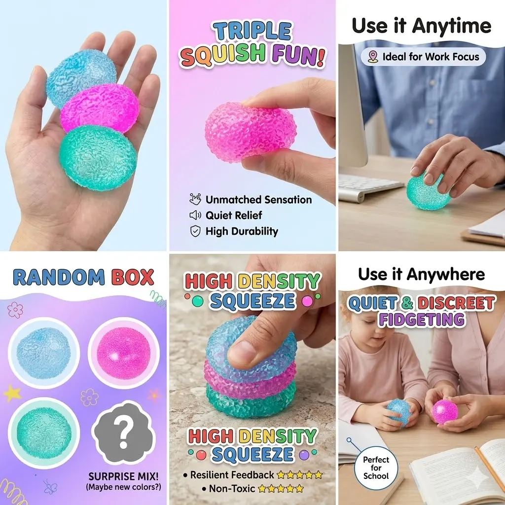 This is asimple, quiet stress relief balldesigned for gentle squeezing and relaxing hand movement -no loud sounds, no distractions.