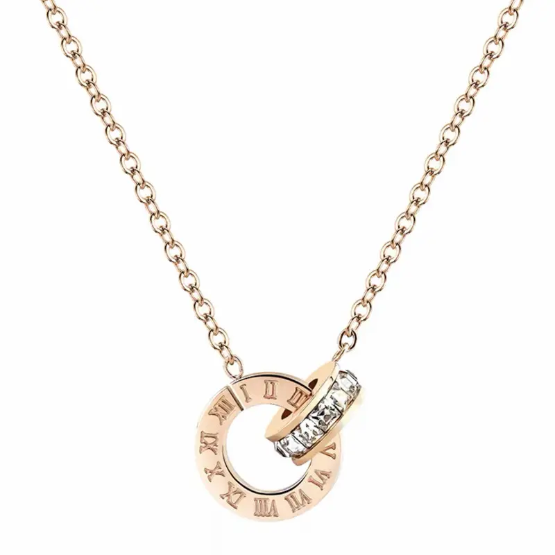 Elevate your everyday elegance with this timeless Roman numeral interlocking circle necklace, a modern classic designed for effortless sophistication. Crafted with premium gold-tone metal, the pendant features two interwoven rings: one engraved with iconic Roman numerals, the other lined with sparkling clear cubic zirconia stones, creating a luminous, eye-catching contrast.