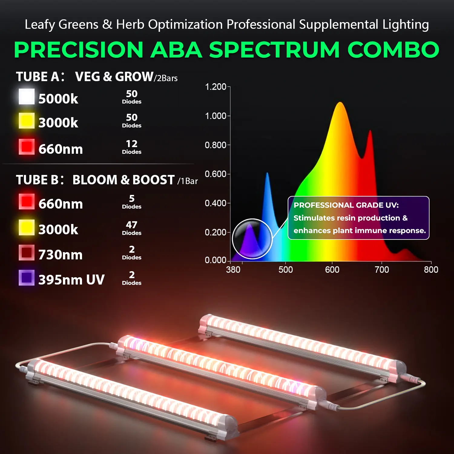 Synergistic ABA Spectrum: A unique blend of 395nm UVA, 660nm Deep Red, and 730nm Far-Red specifically engineered to out-perform standard full-spectrum lights in resin production and cloning success.