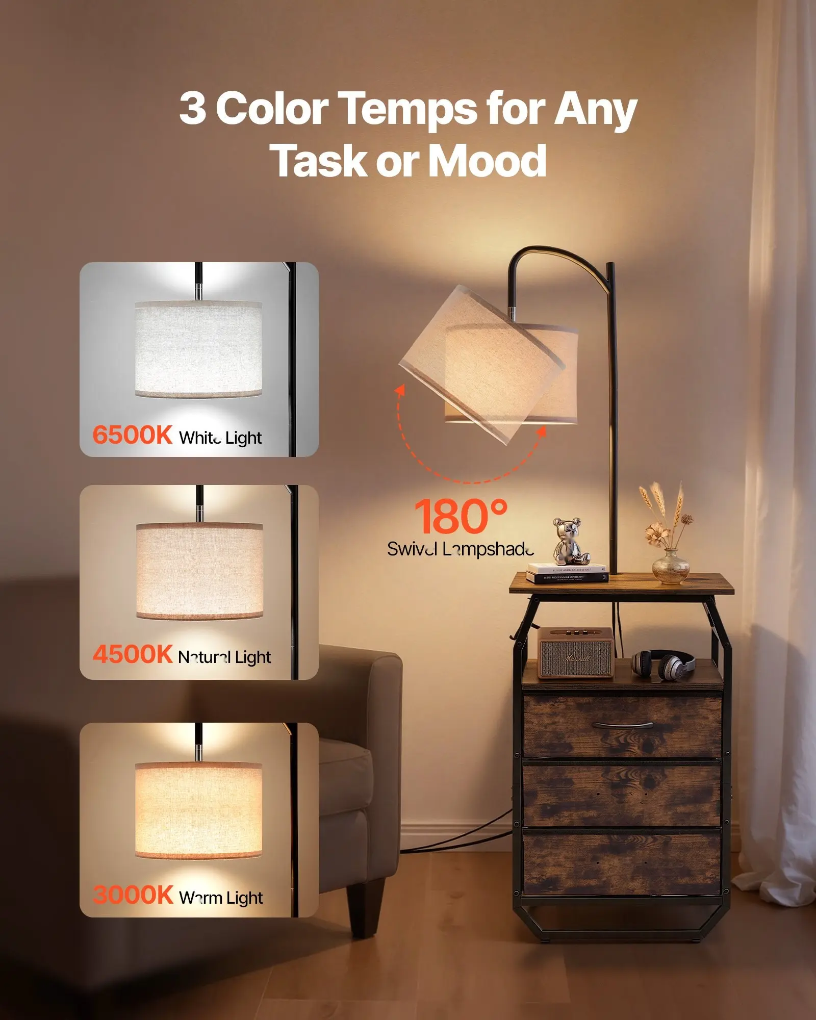 Our end table with lamp provides 3 color temperatures (3000K/4500K/6500K) to suit reading, working, or relaxing. The 180° rotatable shade directs light precisely where you need it and helps reduce glare.