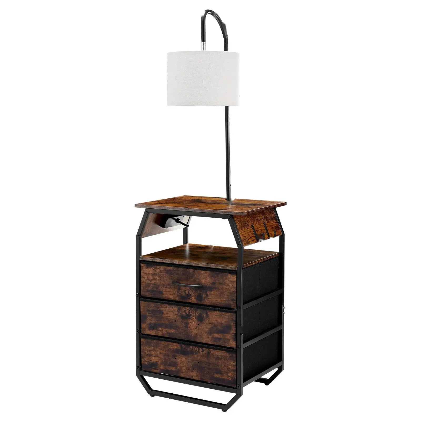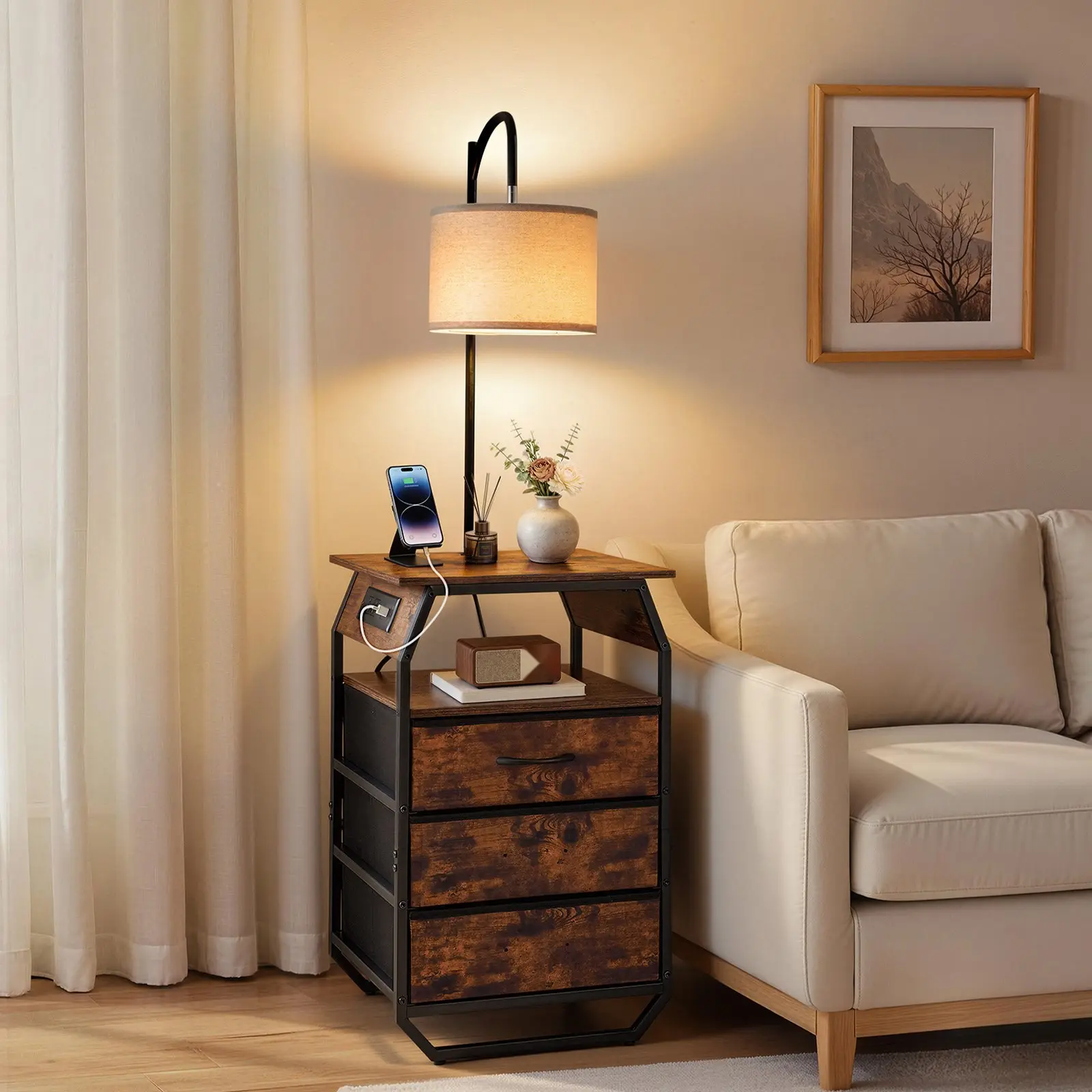·3-in-1 End Table: This floor lamp with table brings storage, lighting, and charging together to maximize function in small spaces. Its mix of rustic farmhouse style and metal industrial design blends easily into any room, elevating your homeâs look