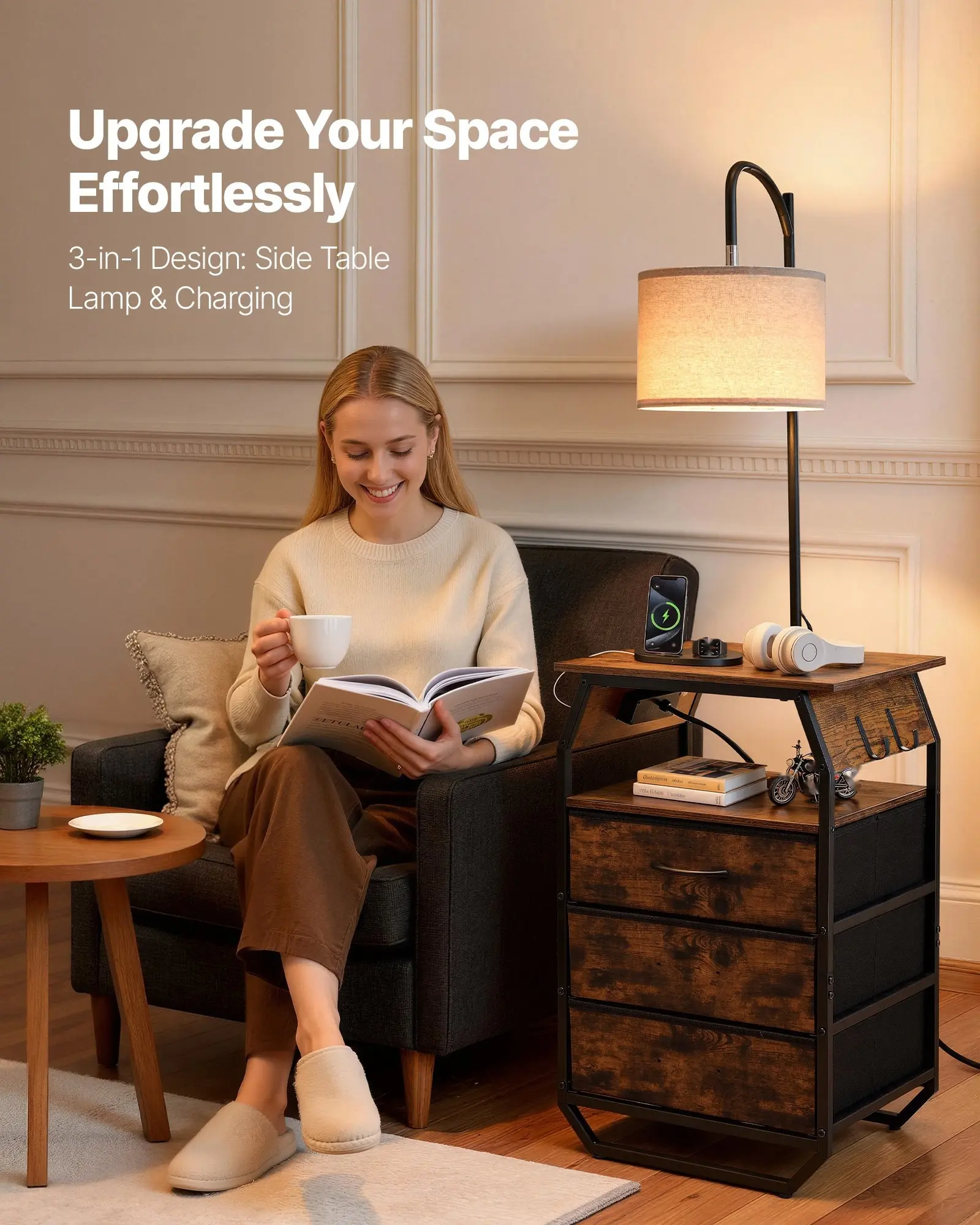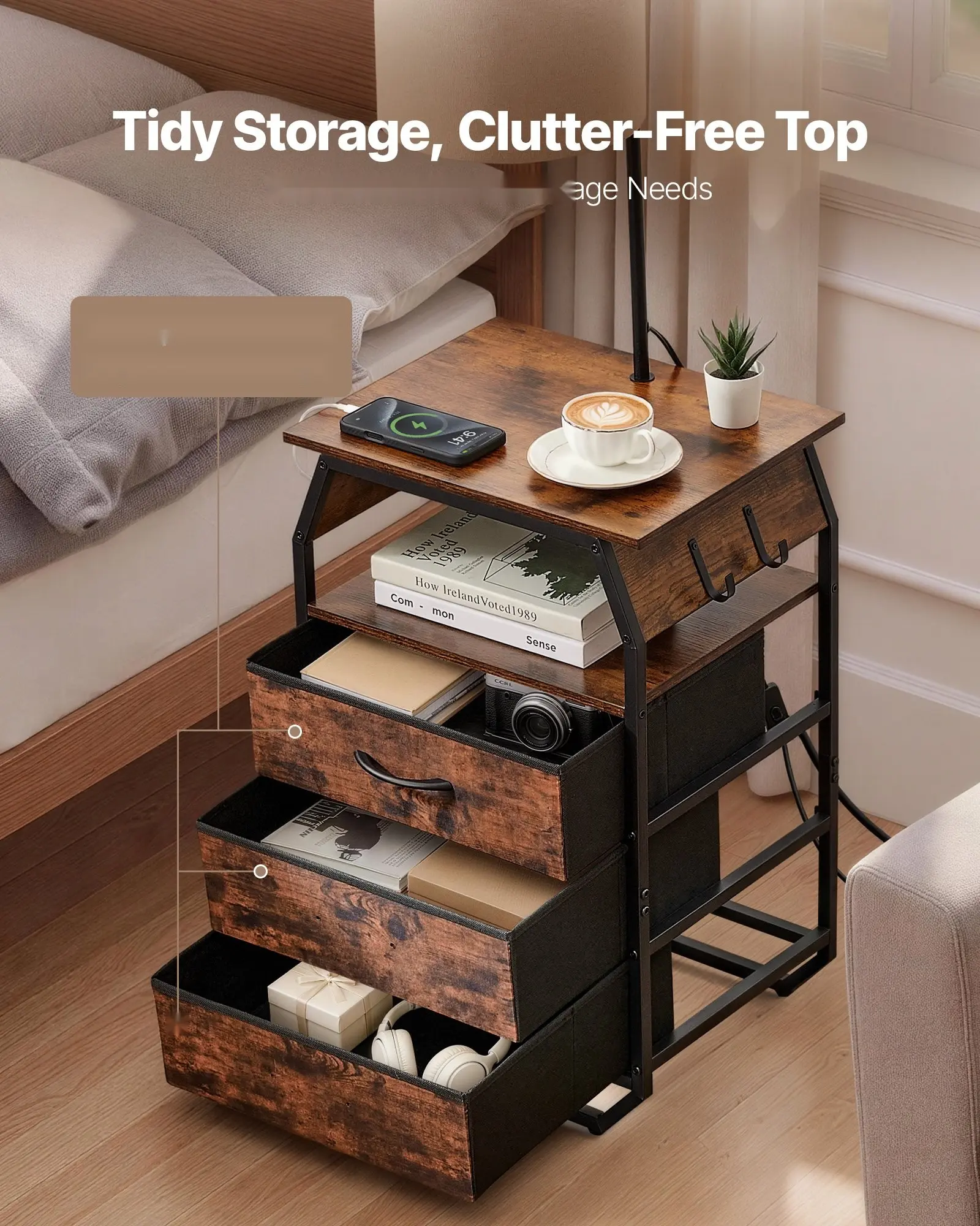 ·Spacious Storage: Featuring 3 sturdy, breathable non-woven drawers that hold up to 12 lbs/5.4 kg each for books, glasses, snacks, or tissues, the side table with lamp also has a wide tabletop supporting up to 120 lbs/54 kg, keeping your space organized