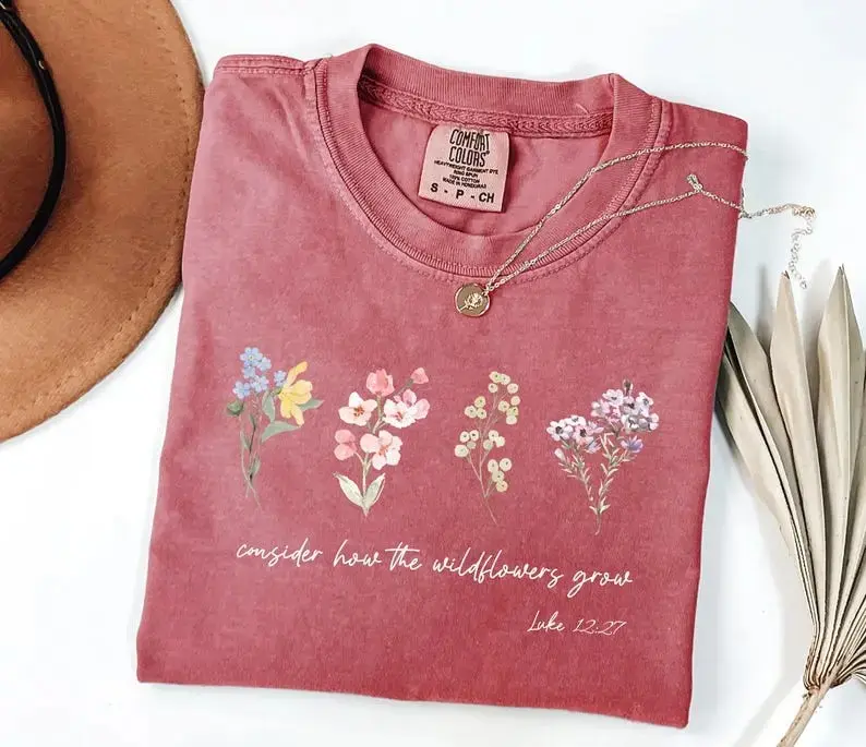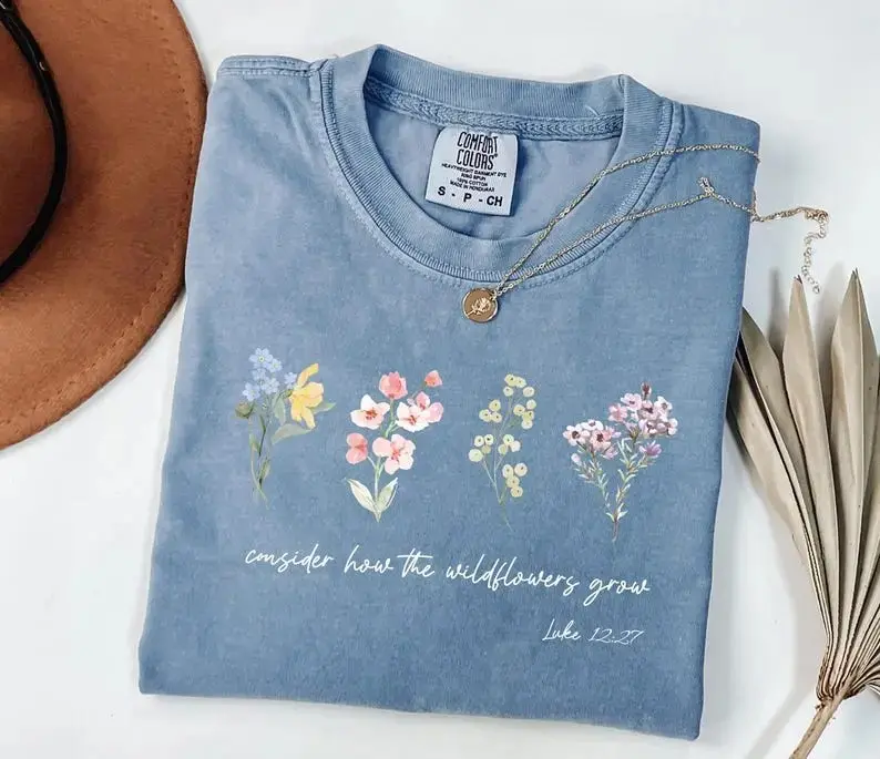 Comfort Colors Consider How The Wildflowers Grow Outfit,Luke 12:27 Shirt,Women's Bible Shirt,Motivational Faith Apparel, Prayer Gift
