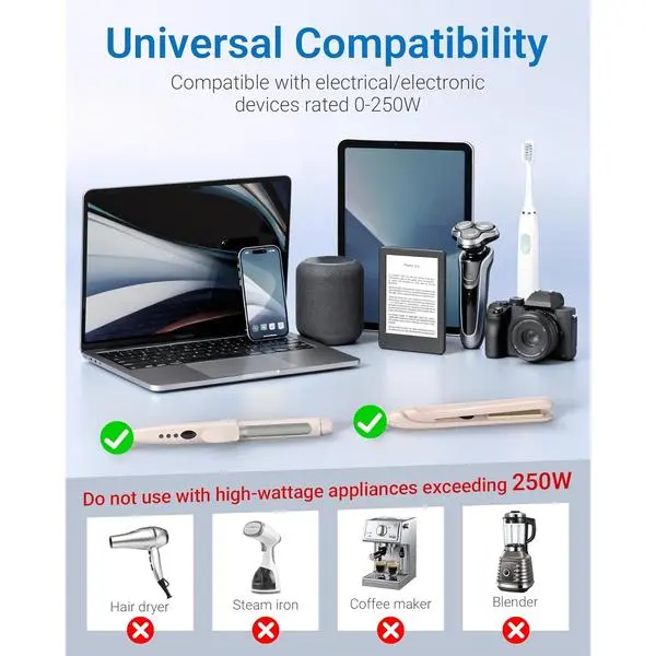·With 250W output power, 4 usb ports and 3 AC ports, this inverter can charge 7 devices at the same time to meet your various needs for international travel.