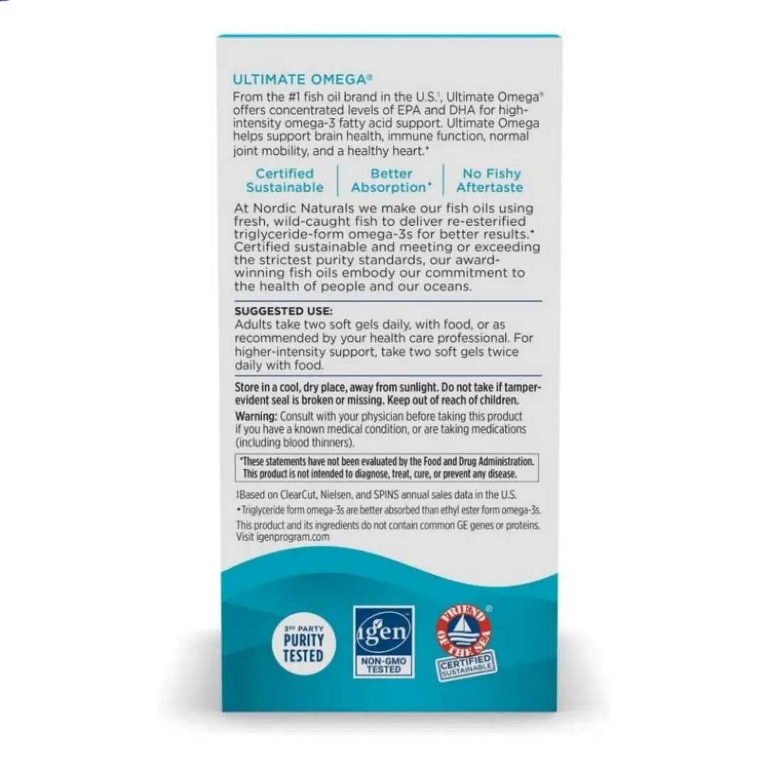 Nordic Naturals Ultimate Omega is a high-potency omega-3 fish oil supplement designed to support overall wellness, including brain and heart health. Each serving delivers a concentrated dose of EPA and DHA, essential fatty acids that play an important role in daily nutritional balance.