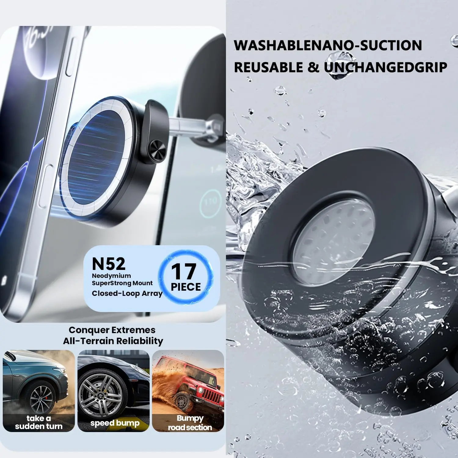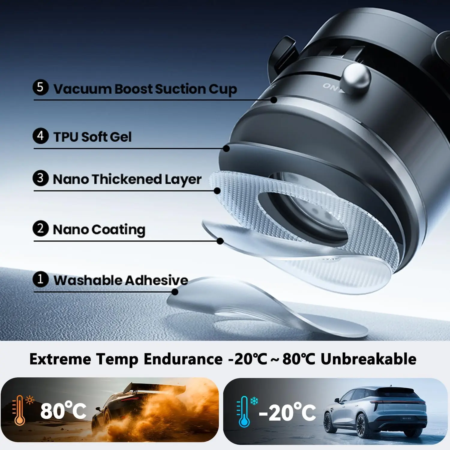 Stronger Magnetic and Clamping Dual Function: With 22 high-performance N55 magnets, this mount's magnetic strength is 200% stronger than standard magnets, If your phone is not an iPhone or does not support magnetic suction, our 360° adjustable vacuum magnetic phone holder also supports clamping function.It has been rigorously tested over 5,000 cycles to guarantee a secure and stable grip, even on bumpy roads or during sudden stops.The precision magnetic design ensures strong adhesion Without disrupting phone signals for clear navigation and calls