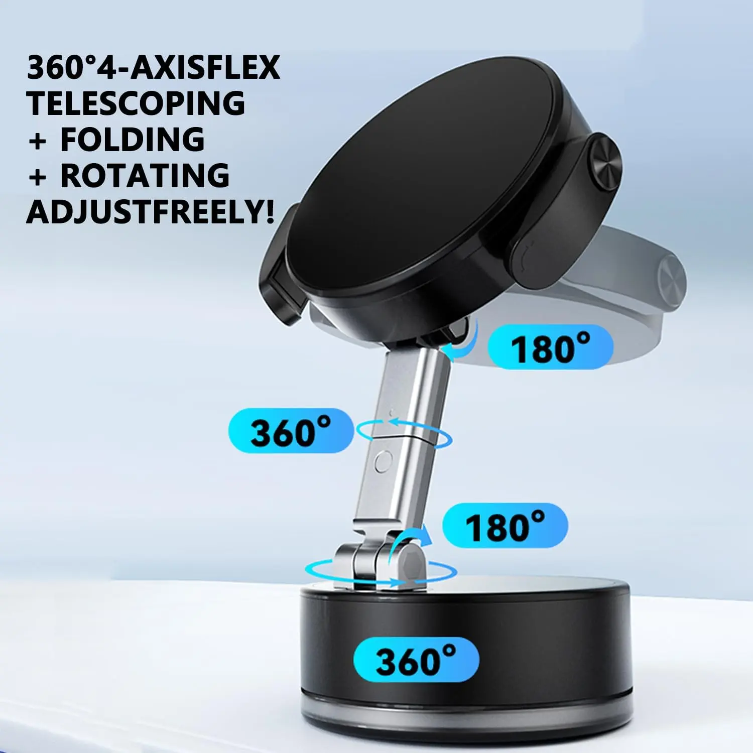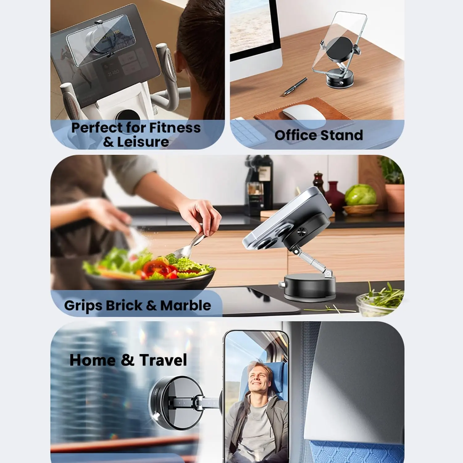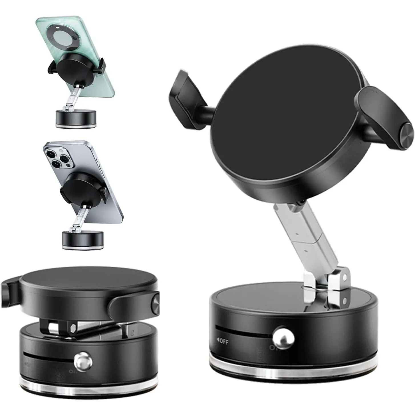 360° Rotation & Dual‑Axis Fold Design : This Vacuum Suction Magnetic Phone Mount with Clamp features a 360° rotating base and 210° foldable metal arms for effortless angle adjustments between portrait and landscape modes.Whether in the car or at the office, switch between portrait and landscape modes effortlessly.Its unique folding design reduces the mount's size by 50% when not in use, keeping your space tidy.Tested over 3000 times for durability, it remains stable and reliable for long-term use
