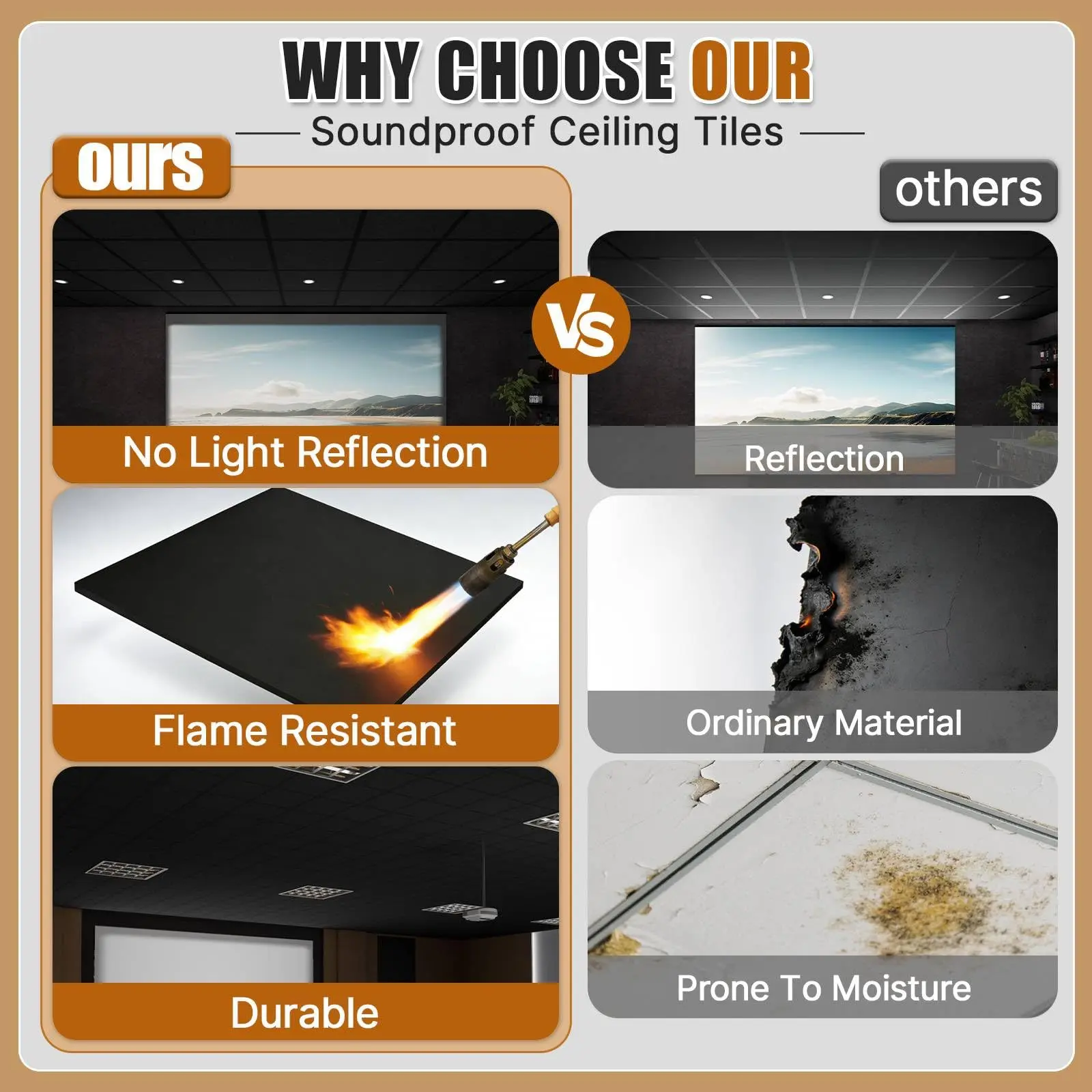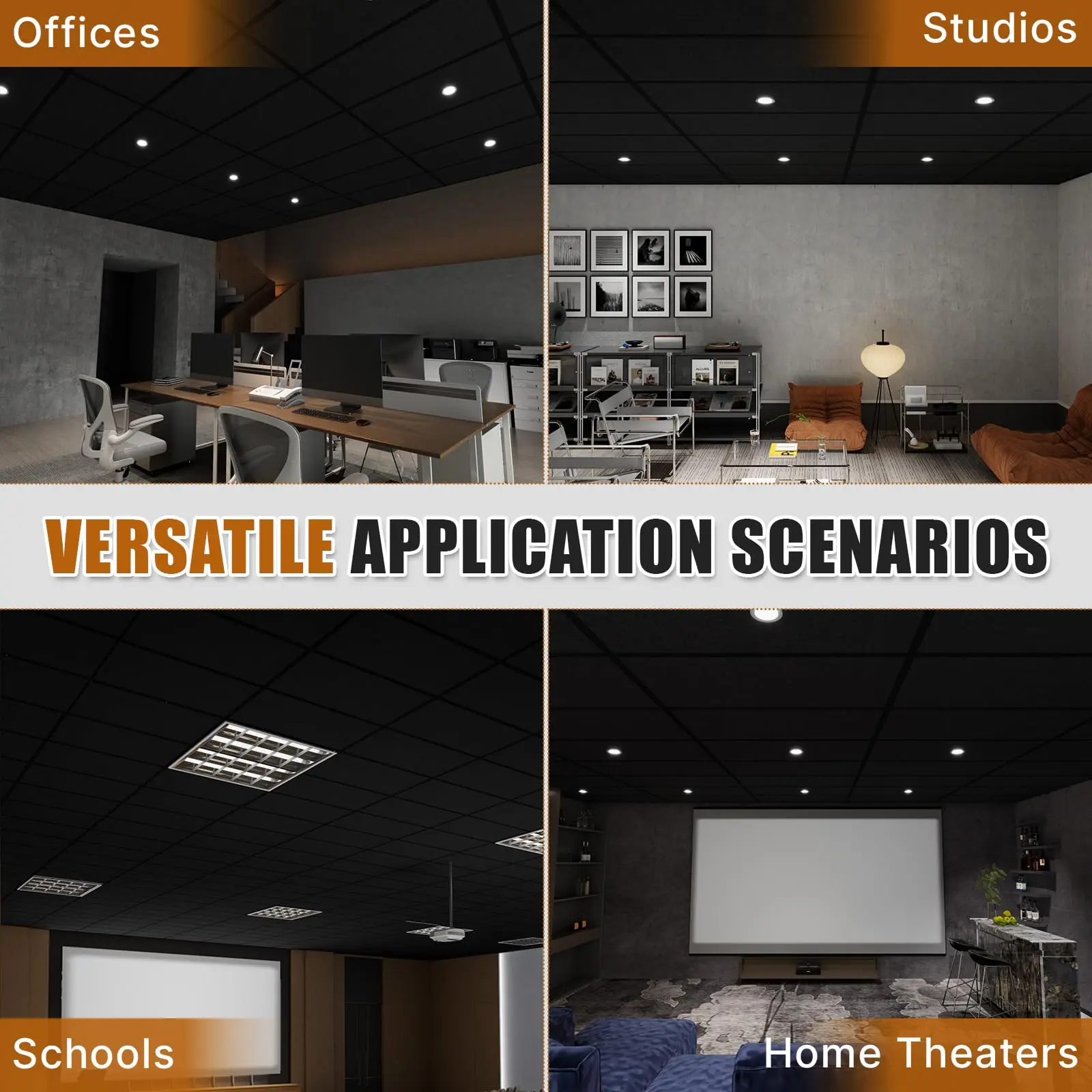 ✨ Upgrade Function: Engineered with Fiberglass, these tiles reduce echo and reverberation. The non-reflective black surface eliminates light bounce and glare. They transform any space into a quieter, more focused environment. Perfect for home theaters and basements.