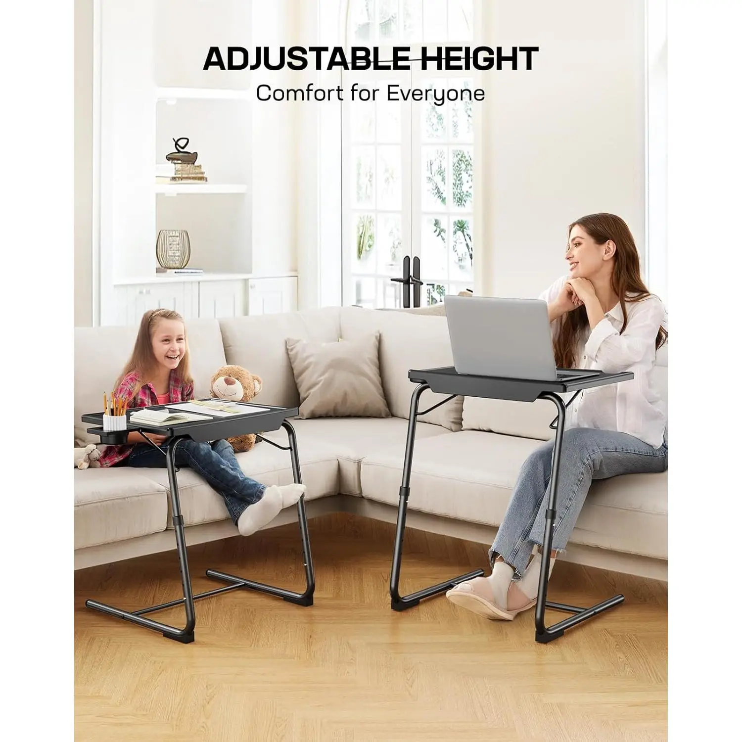 Designed as a multipurpose TV tray, the can be adjusted to 6 heights and 3 angles for various applications.