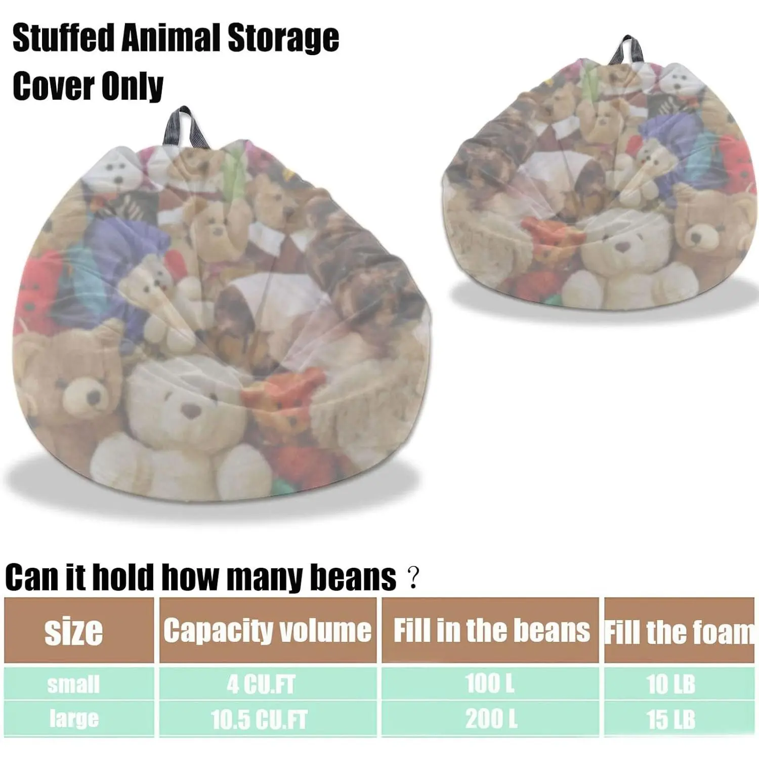 L for Adults: 45*36 inch toy bag can fit 300L of filling.