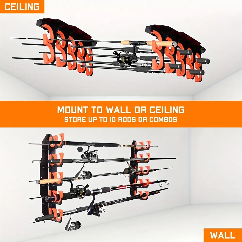 Space-saving 2-piece fishing rod rack | Wall-mountable or ceiling-mounted, featuring soft TPU padding and ABS plastic construction, suitable for storing surf fishing, spinning, aluminum alloy, and trolling rods (accommodates up to 5 rods)