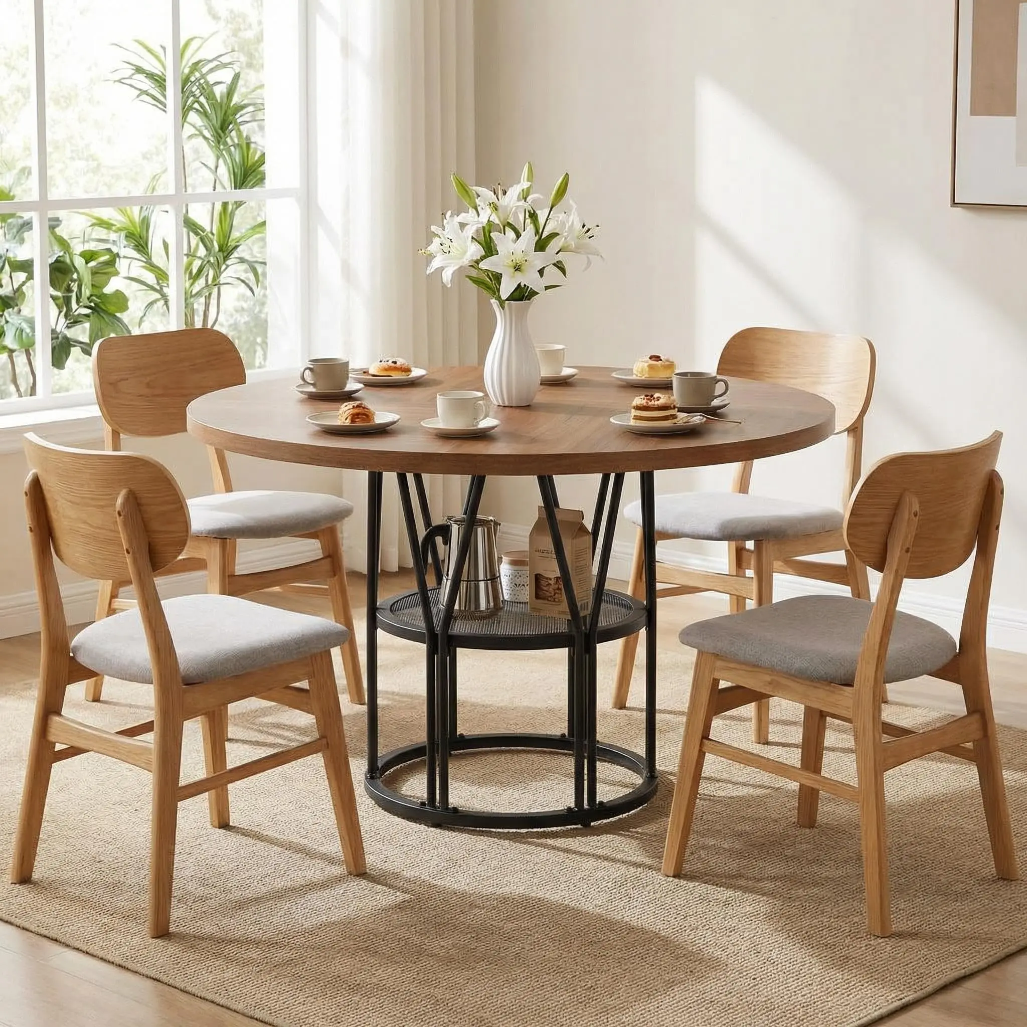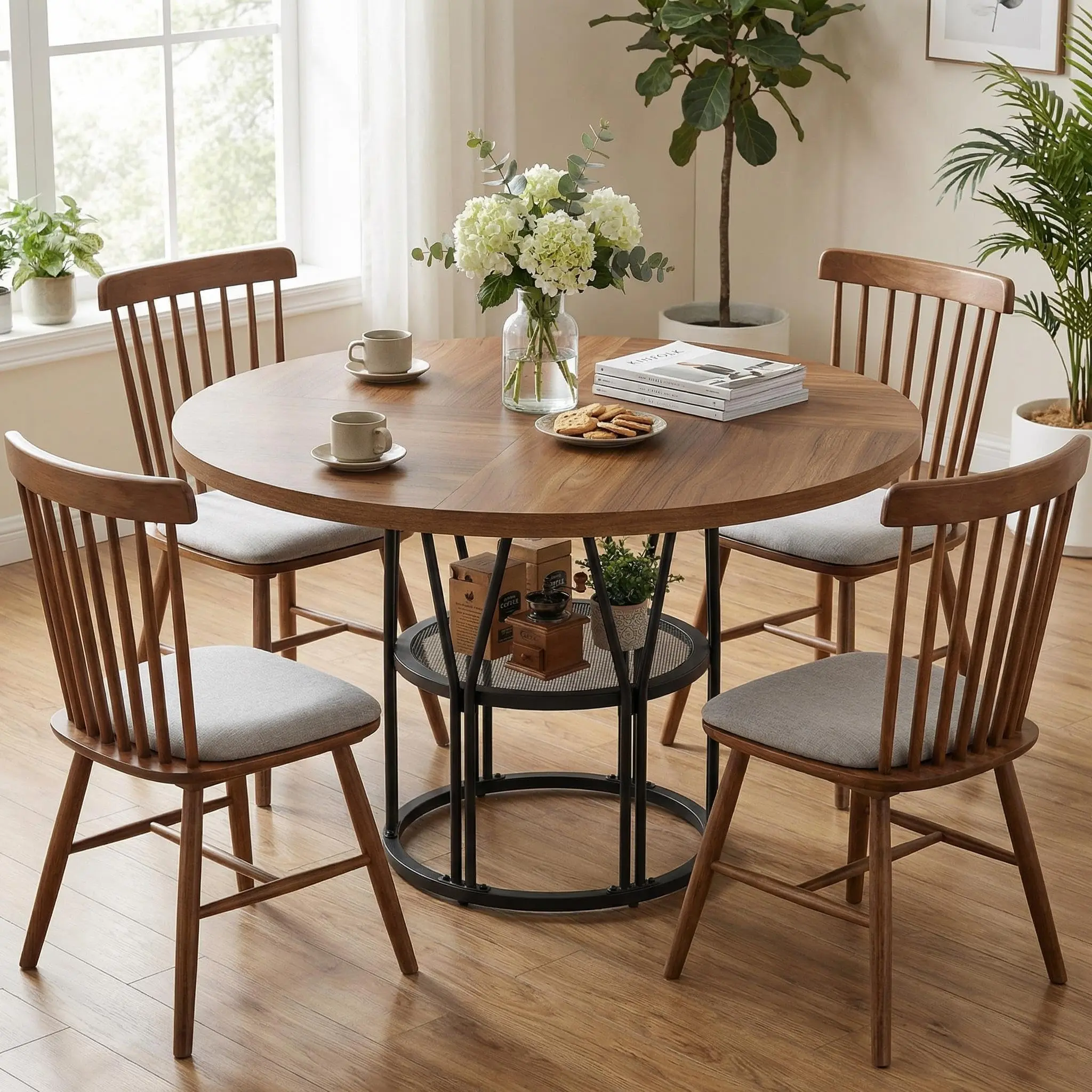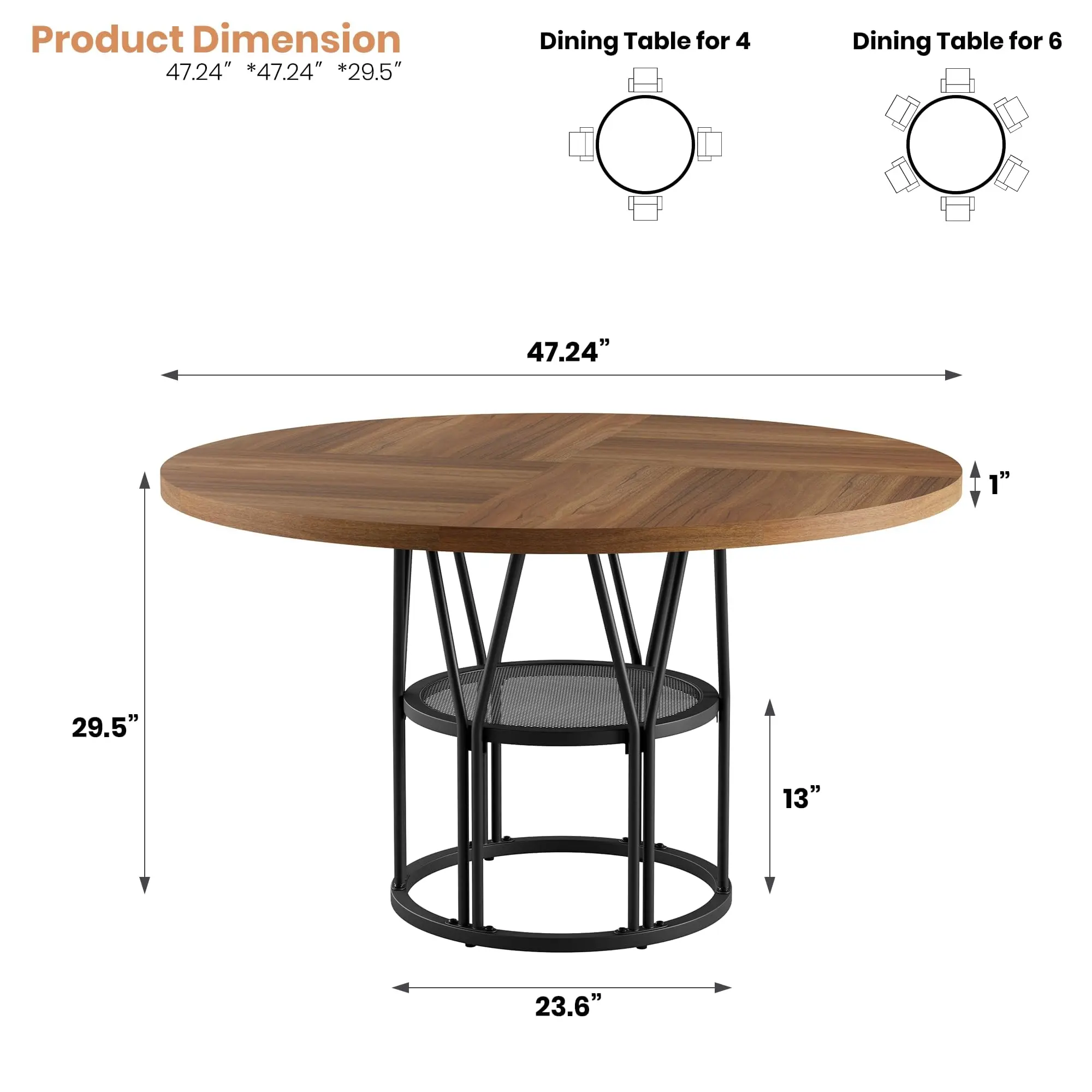· 【Ample Storage Space】Thoughtfully designed 23.6”W storage shelves provide the space for tableware and kitchen essentials, keeping the dining table organized and clean. The 47-inch diameter circle kitchen table is the perfect ideal for party gatherings of 4-6 people and it promotes family conversation closer and happier