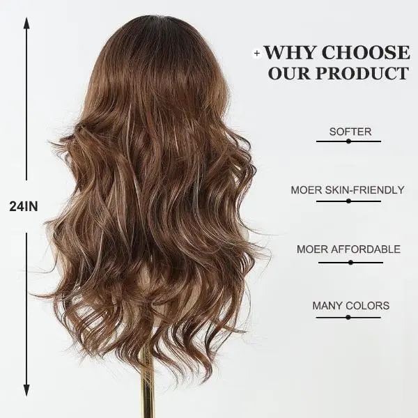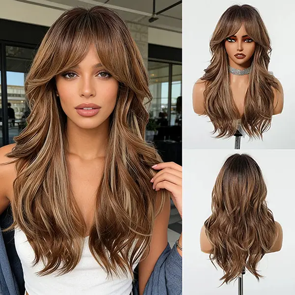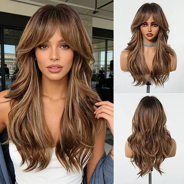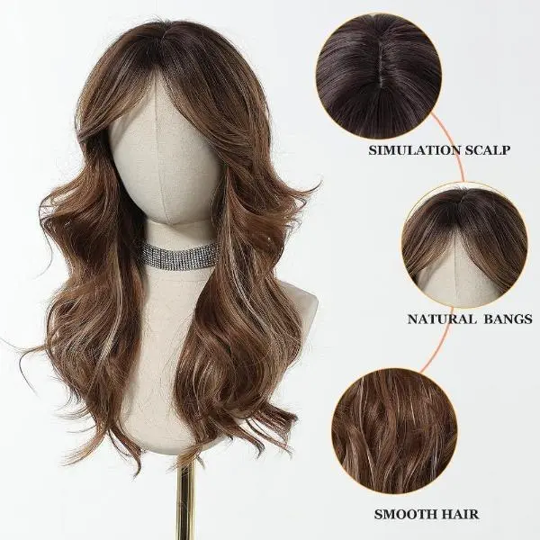 Elevate your style with this 24-inch brown balayage highlight wig. Perfect for women, it features long wavy hair with curtain bangs. Glueless and heat-resistant, it's ideal for daily and party wear. Order now and get a FREE 5-piece luxury gift set with every purchase. Enhance your look effortlessly with this natural-looking synthetic wig.