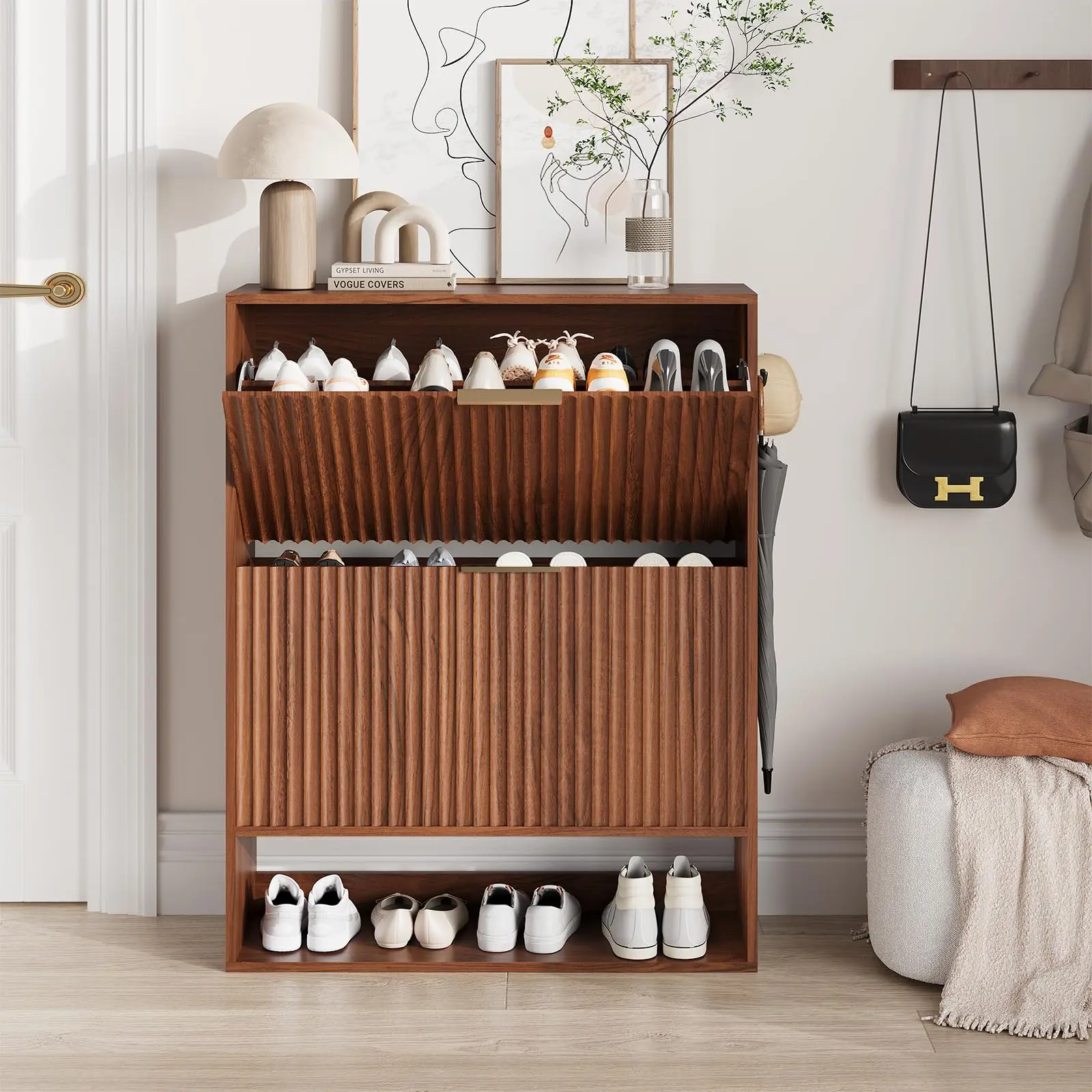 Garvee 31.5'' Shoe Cabinet for Entryway with 2 Flip Drawers, Fluted Slim Shoe Storage Cabinet, Narrow Free Standing Wooden Shoes Organizer for Foyer, Hallway