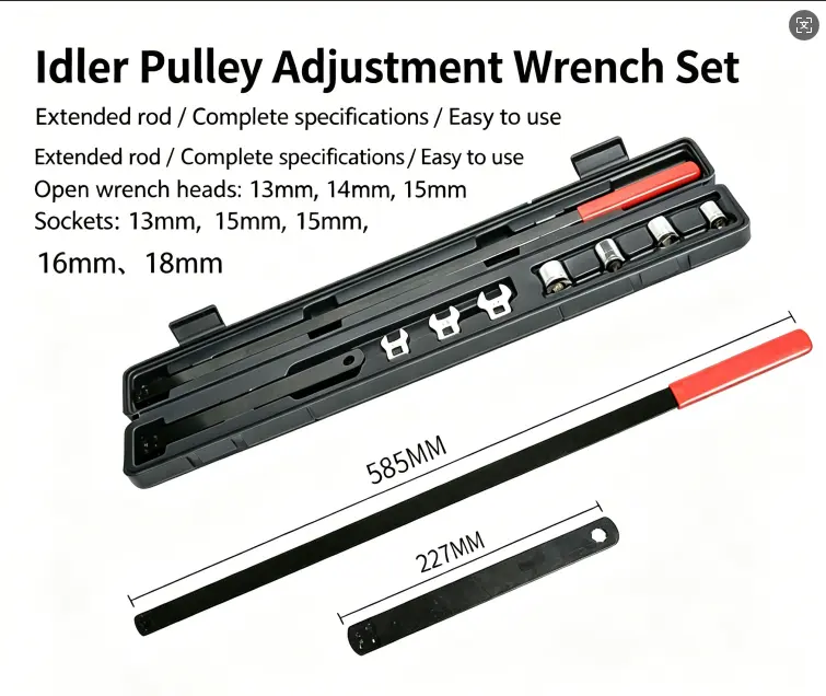 This 8-piece set is ideal for adjusting engine accessory drive belts. Made from Cr-V steel, it offers durability and torque resistance. Perfect for mechanics, auto repair shops, and DIY enthusiasts. The set includes 3 open-end wrench heads (13mm, 14mm, 15mm) and 4 impact sockets (13mm, 15mm, 16mm, 18mm). It also features a long extension bar (585mm) and a short extension bar (227mm).