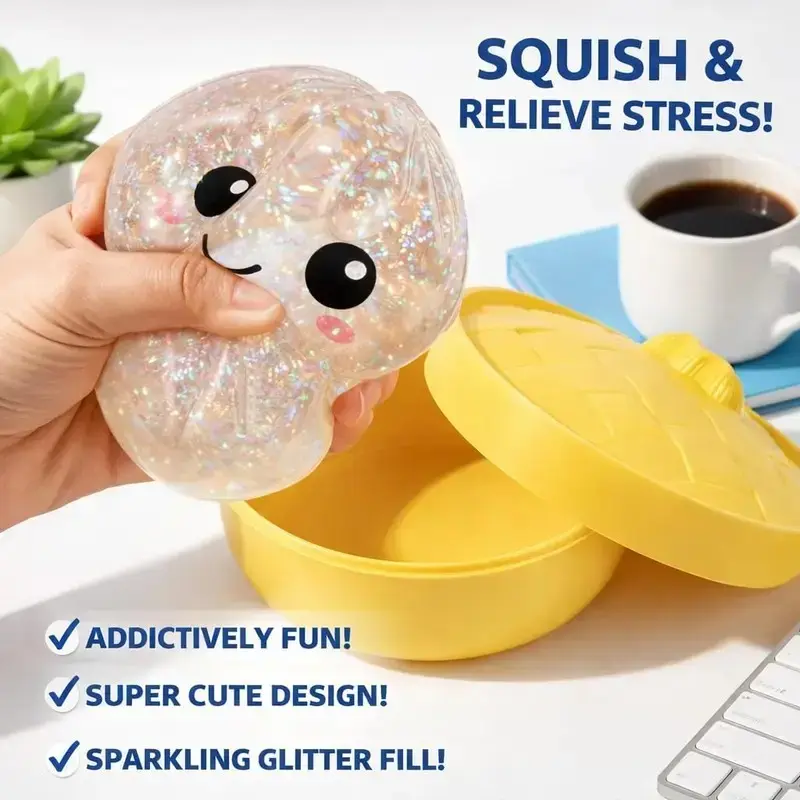 2026 New Glitter Dumpling Squishy with Steamer Box, Soft Sensory Fidget Steamed Bun Squeeze Tool for Adult Stress & Anxiety Relief,