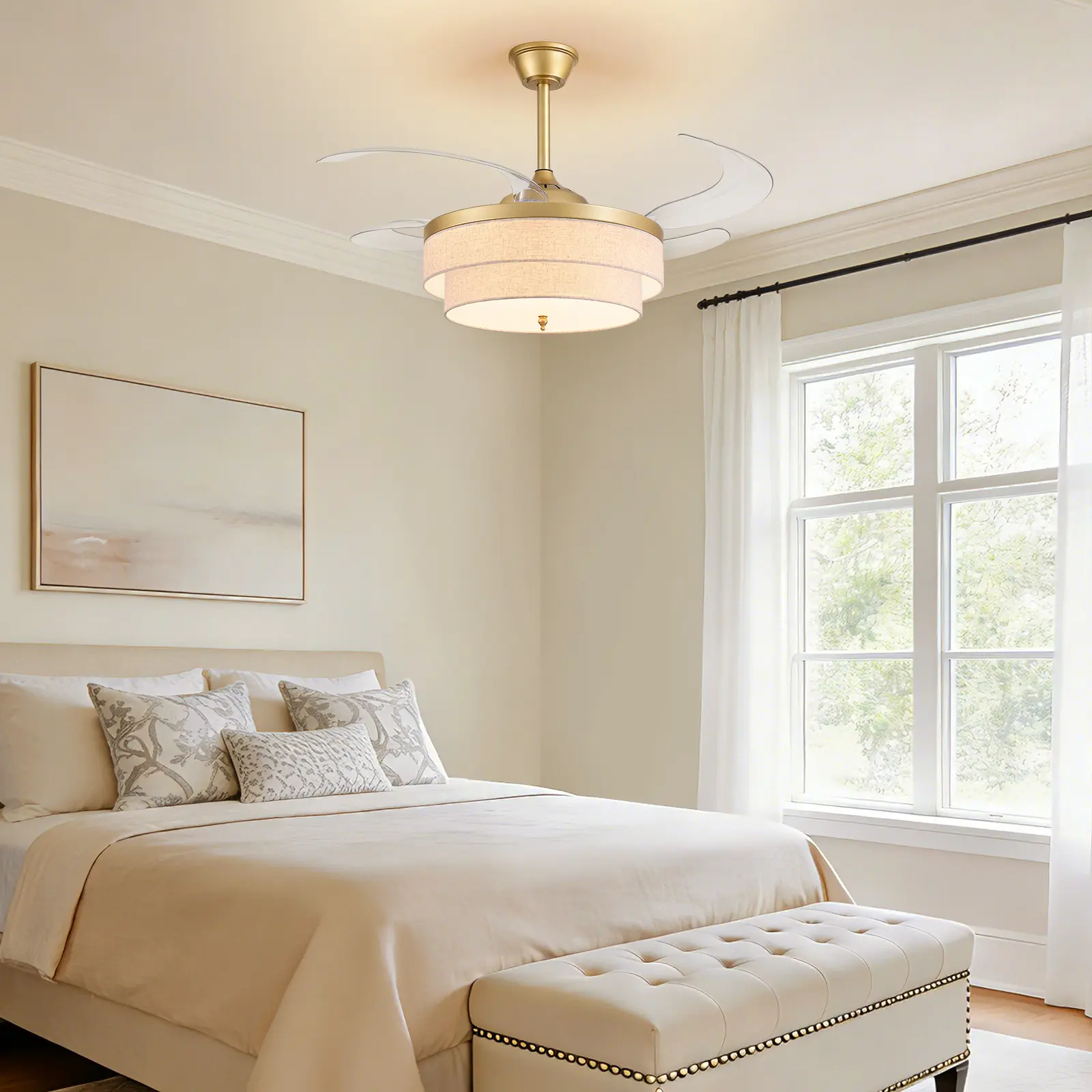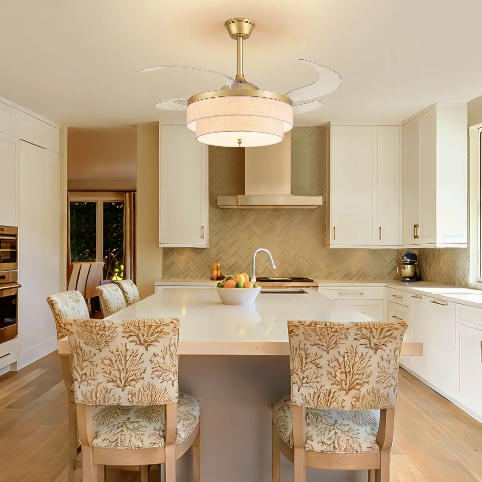 ·【Natural Texture & Airy Comfort】 This modern ceiling fan features a luxurious gold-finished metal body paired with soft beige canvas shade and stunning transparent fan blades. Creates a light, airy aesthetic while ensuring silent, efficient airflow. Its timeless design makes it perfect for bedrooms, dining rooms, living rooms, kitchen islands, farmhouses, and more