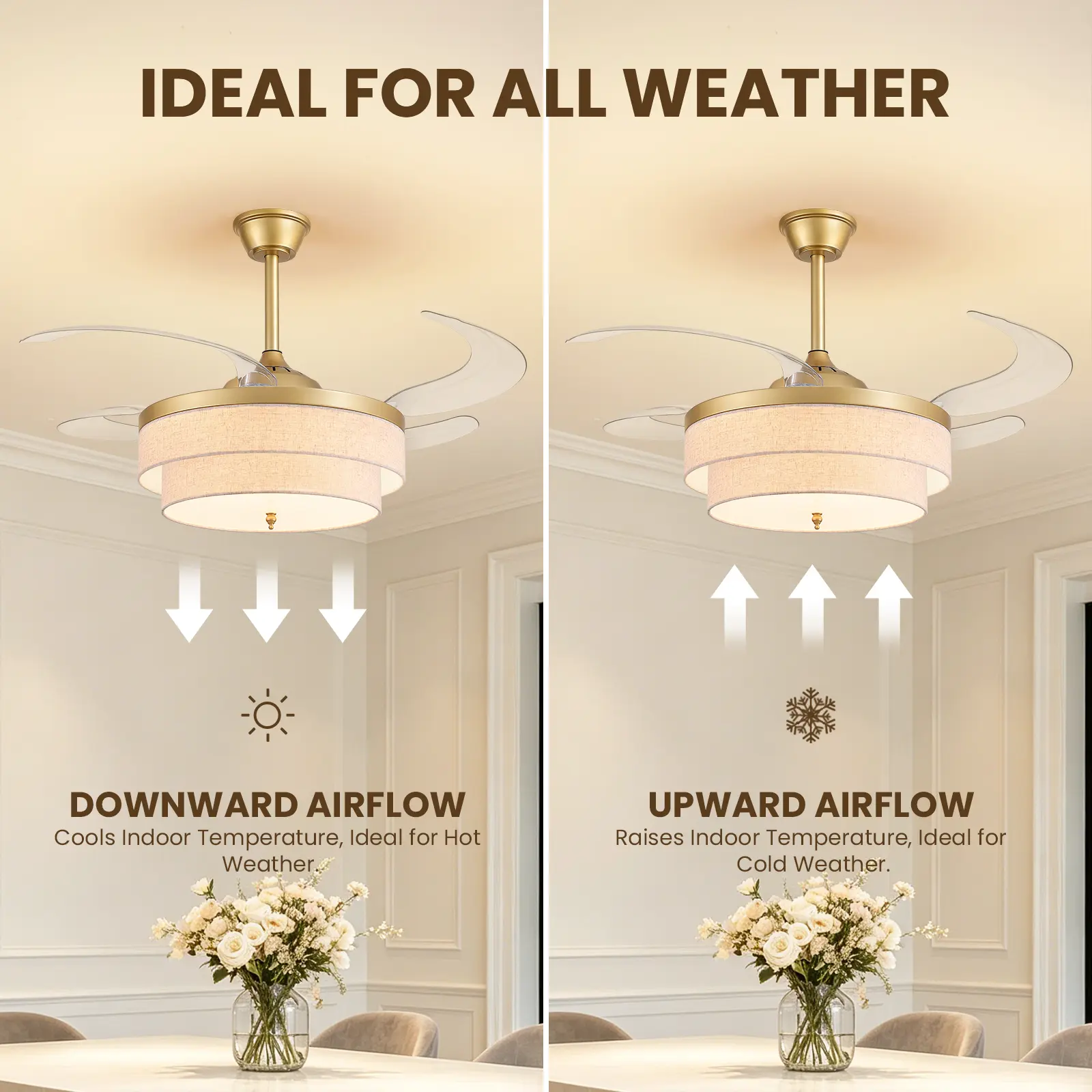 ·【Reversible & Silent】 Powered by an upgraded pure copper DC motor, this retractable fandelier operates quietly and smoothly. The reversible mode provides cool airflow in summer and promotes warm air circulation in winter, ensuring year-round comfort and efficiency