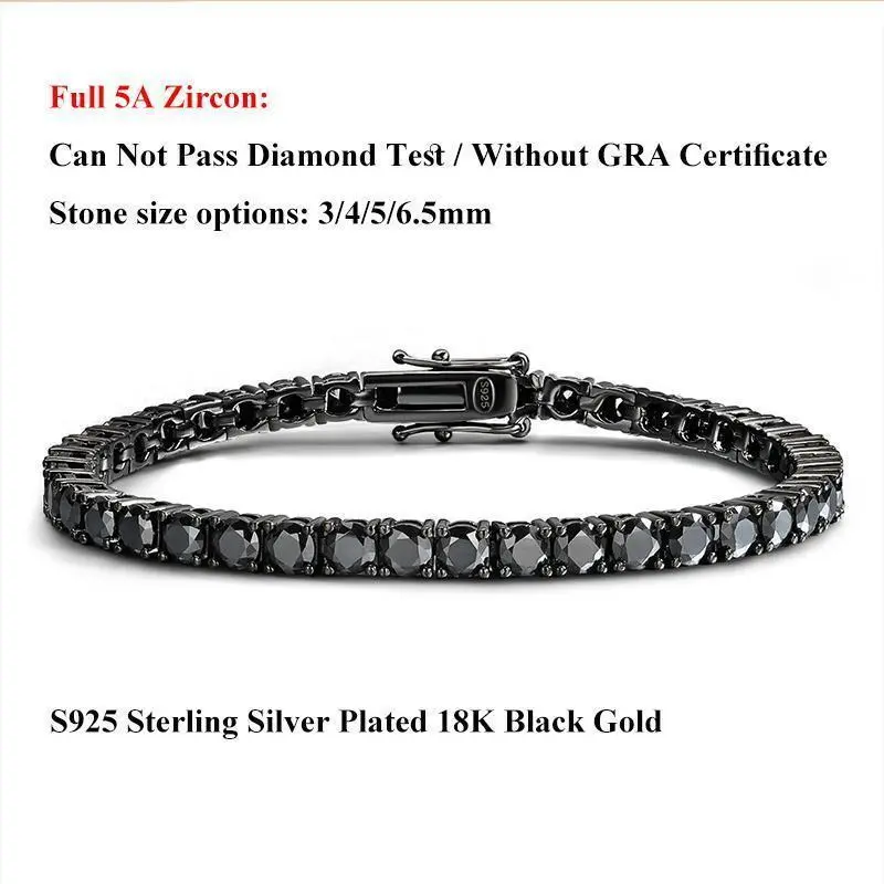 EWYA Full 3/4/5/6.5mm Black Moissanite Tennis Bracelet for Men Women Unisex 925 Silver Plated 18K Black Gold Hip Hop Bracelets
