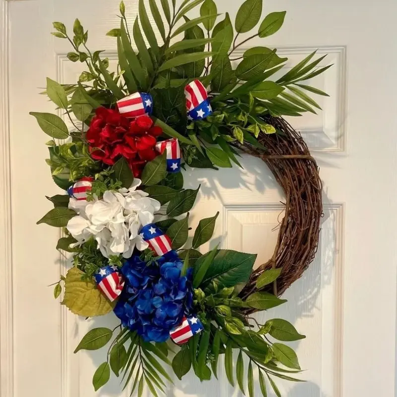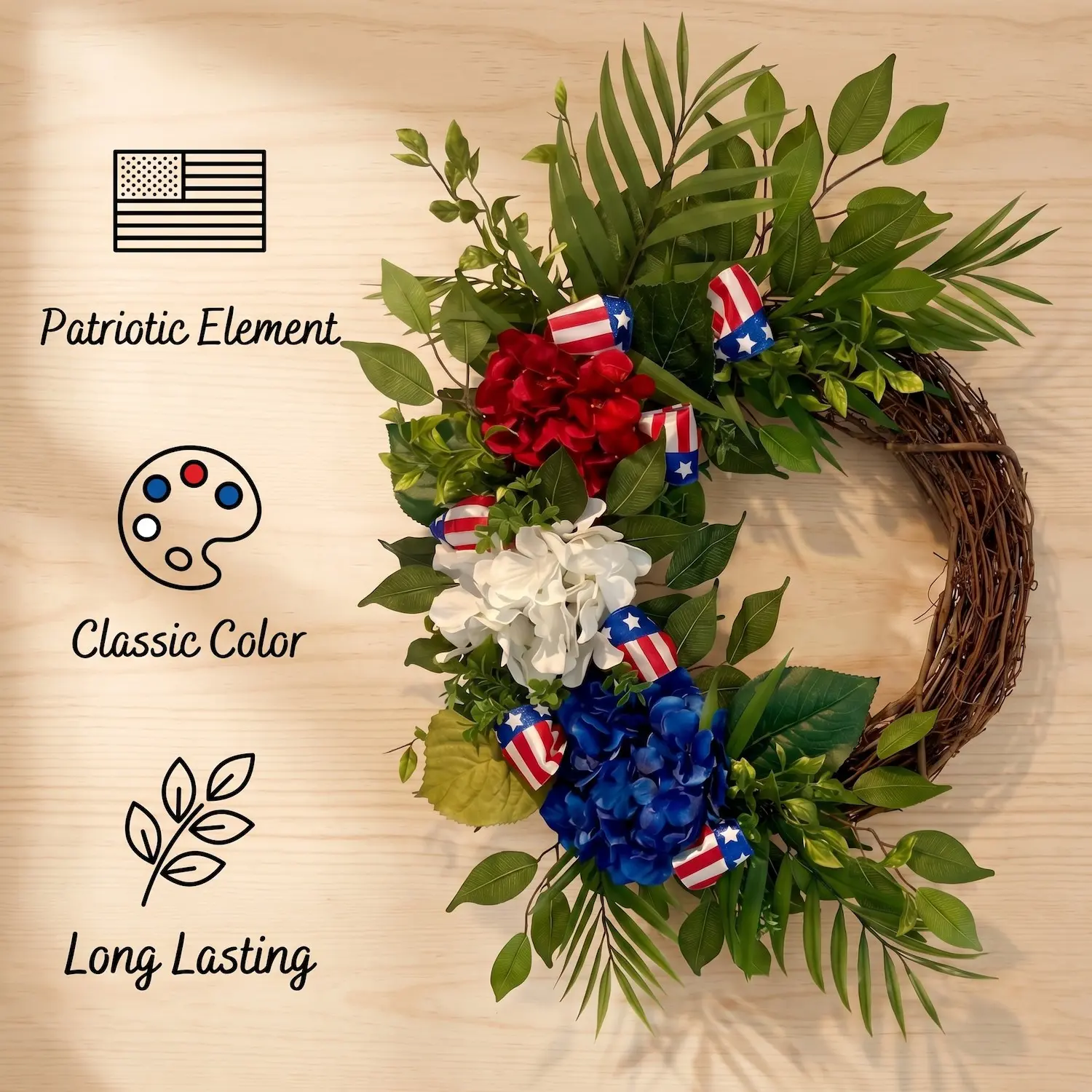 Patriotic Theme Artificial Hydrangea Woven Garland, Blue Hydrangeas with American Flag Design, Rural Cottage Style, Outdoor Decor
