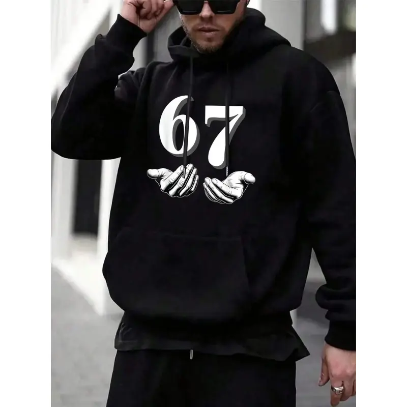 Men’s Fall Winter Black 67 Print Hoodie, Bold Graphic Design. Oversized Comfortable Fit, Warm Cozy Fabric. Trendy Streetwear Style, Perfect for Cool Weather Outfits. Unisex Hoodies