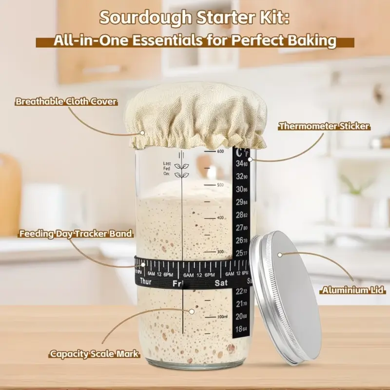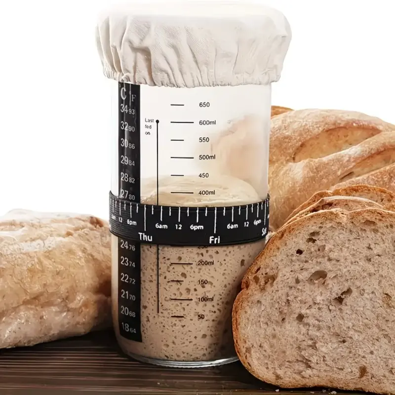 Large capacity & easy to use. The sourdough jar has a 24 oz capacity and makes 3 sourdough loaves. You can easily add flour and water to this wide-mouth glass jar and remove the starter when needed. A spatula aids in the efficient stirring, and a temperature sticker helps you monitor the starter temperature in real-time. The Date/time feeding tape helps you keep track of time. Easy to observe and clean (dishwasher safe).