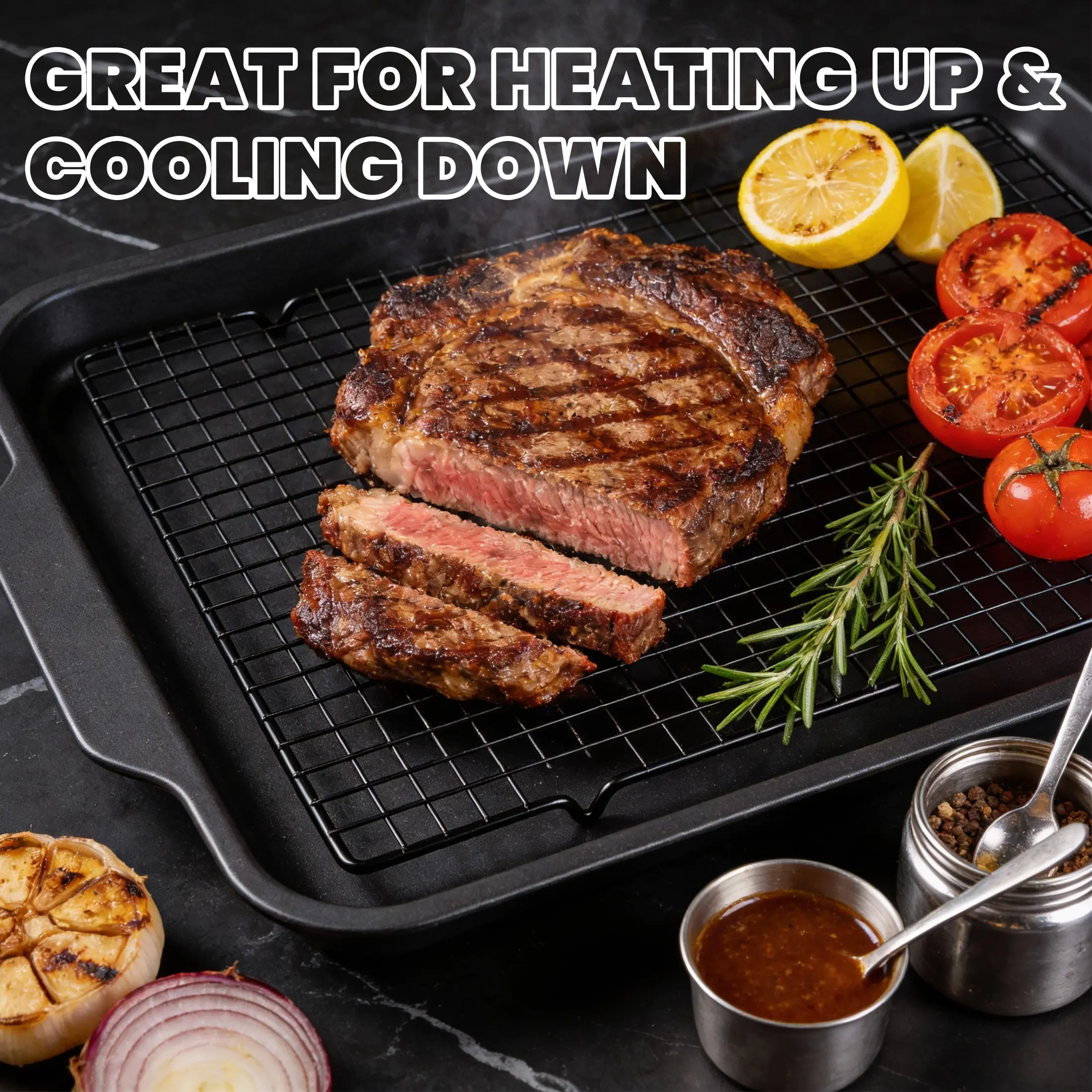 This set includes two 10" x 15" grid wire racks, ideal for oven cooking. Perfect for baking, grilling, roasting, and more. The black color adds a sleek touch to your kitchen. These racks are versatile, enhancing your cooking experience.