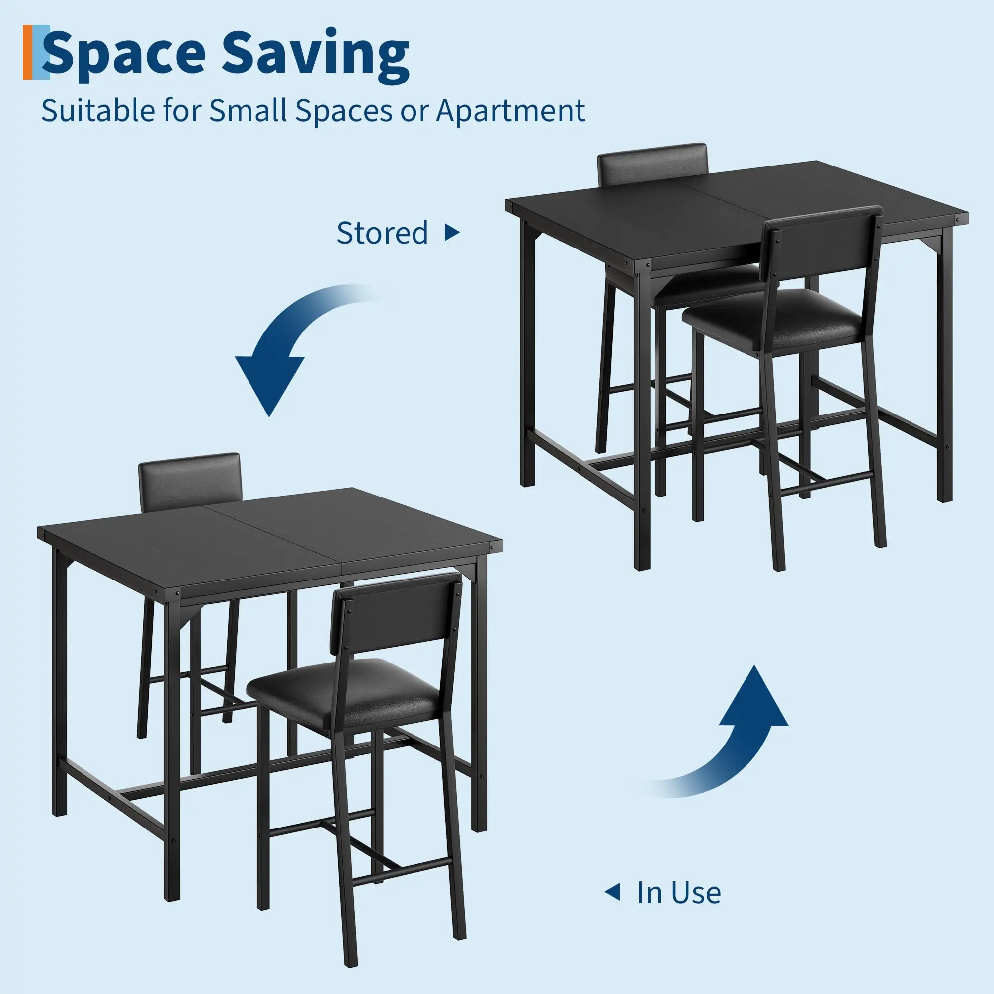 · 【Compact & Efficient Design】Measuring 35.5" x 29.5" x 35.5", the counter-height dining table and two 15.6" x 15.7" x 36.5" bar chairs are an ideal fit for smaller spaces such as apartments or studios. The dining chairs tuck neatly beneath the table, saving valuable floor space and keeping your area tidy. Available in multiple finishes, this dining table set for 2 complements various interior styles and fits seamlessly in kitchens, dining rooms, or lounge areas.
