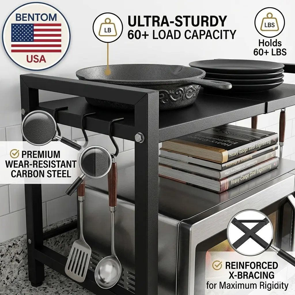 ·Built Like a Tank: Made of thickened carbon steel. Holds up to 60 LBS without a single wobble. Yes, that heavy microwave? It’s got it!