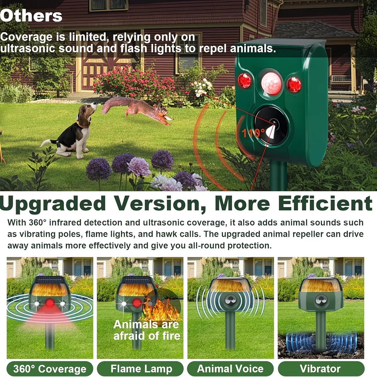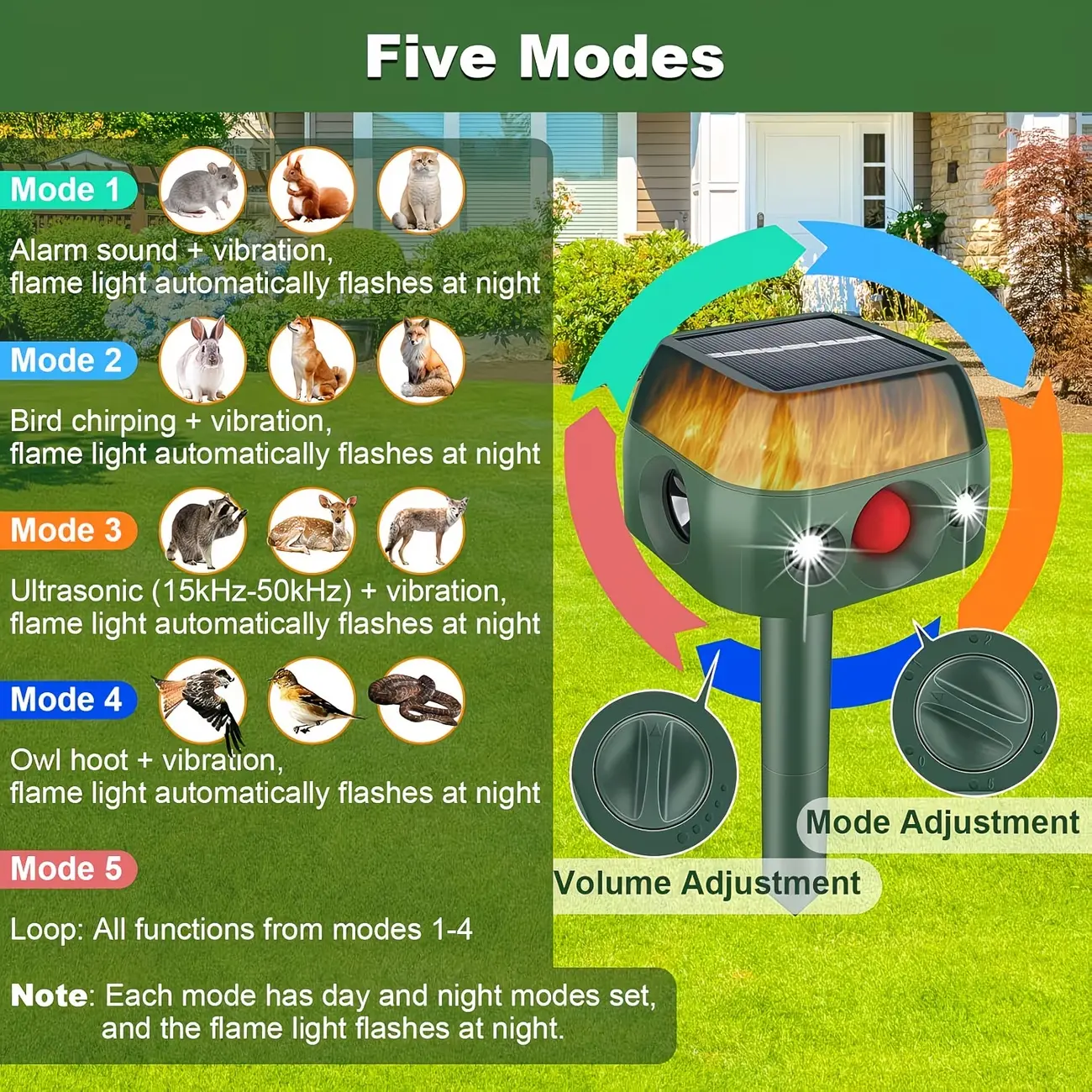 ·Five Operation Modes Solar Ultrasonic Animal Repellent: The animal repellent outdoor has 5-level function adjustment,1: ultrasonic horn alarm+vibration drive mode,2:ultrasonic horn emits bird call+vibration drive mode,3: ultrasonic +flame flash +vibration,4:ultrasonic horn emits an owl call +vibration drive mode,5: infrared flame LED +vibration night mode,cycling mode from 1to 5 all functions until the animal is driven out of the sensing range. Different frequencies repel different animals