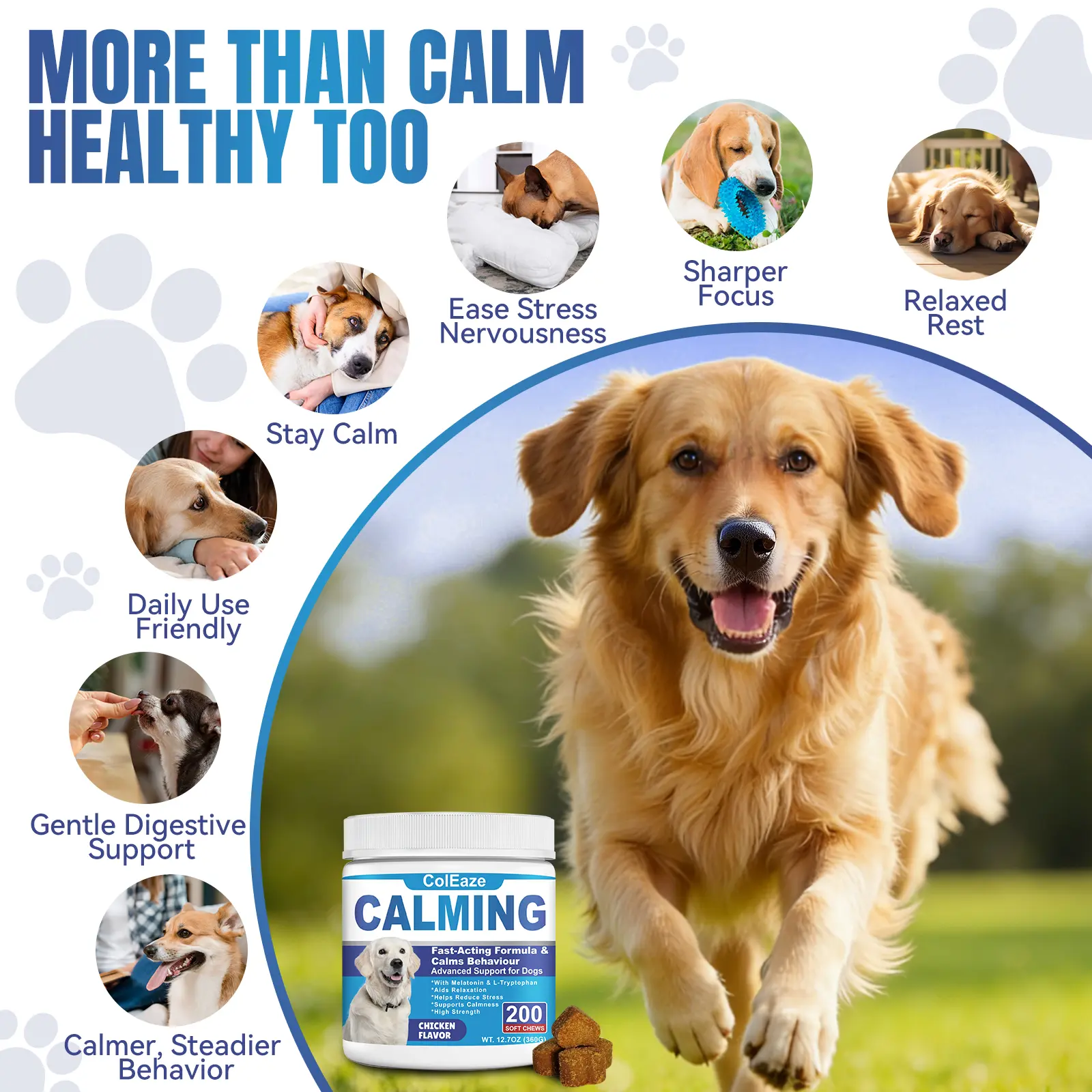 Stress & Anxiety Relief: Targets occasional nervousness, hyperactivity, and stress triggered by noisy environments (e.g., thunderstorms, fireworks), unfamiliar settings, travel, grooming, or vet visits.