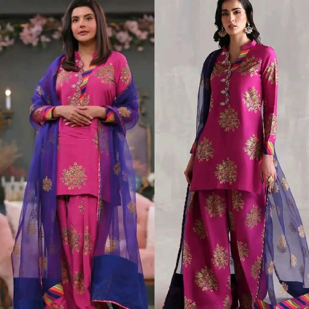 Introducing our exquisite set crafted from luxurious Lava silk fabric, featuring three pieces: a stylish shirt and matching trousers. The shirt is adorned with block print stunning lace on the front, This ensemble effortlessly combines sophistication and artistry, making it perfect for any special occasion. Experience the perfect blend of comfort and elegance with this beautifully designed outfit.