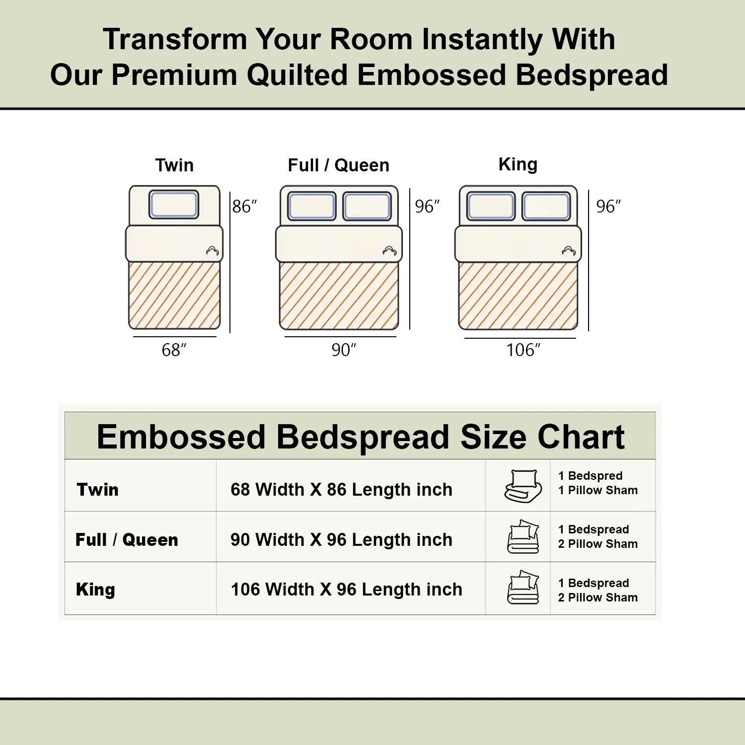 Each bedding set includes a carefully designed quilted bedspread with matching pillow sham(s) for a coordinated and elegant bedroom presentation.